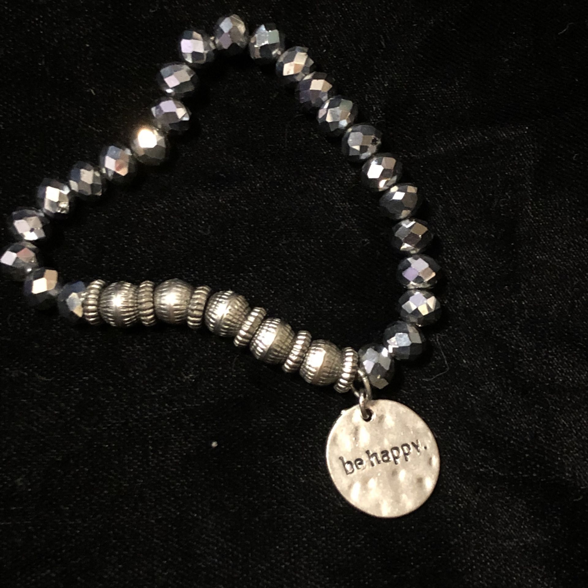 Silver beads with “Be Happy” charm. Stretchy. No clasp.