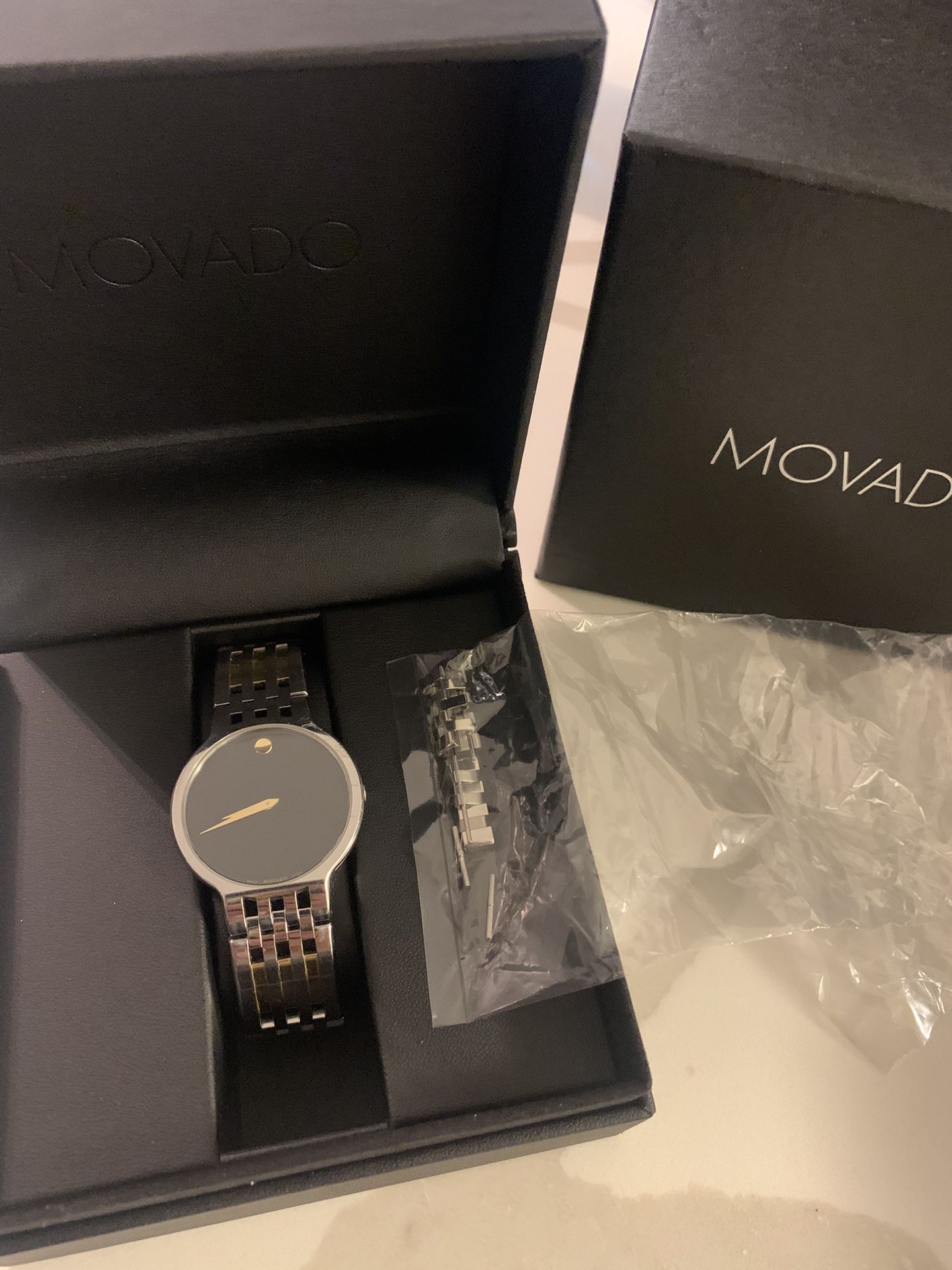 This watch is used and does have some scratches not to noticeable when wearing, also comes with extra band links incase you need to make it bigger.