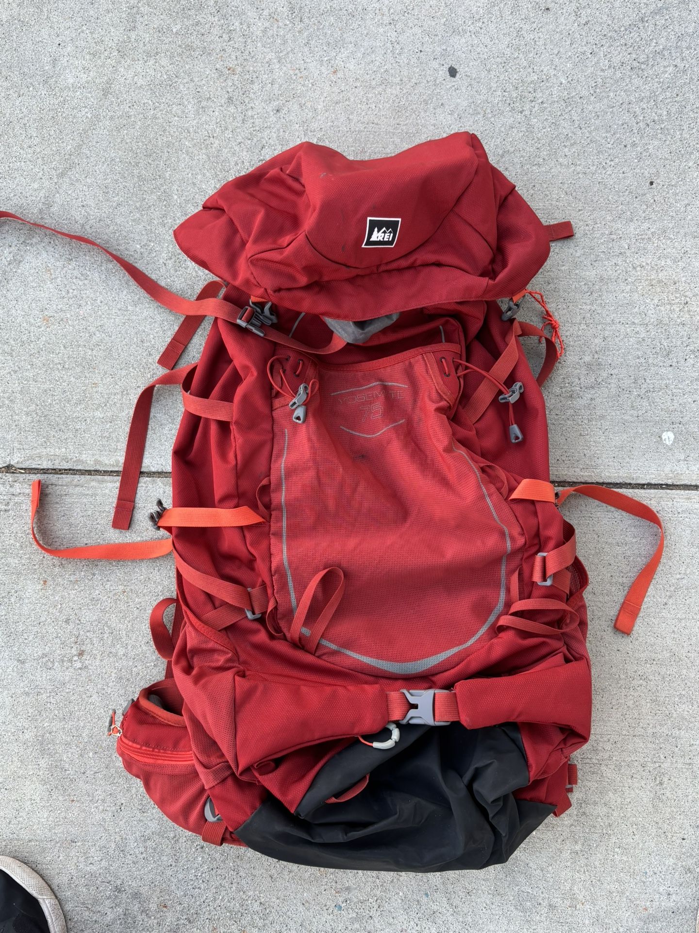 Used once -REI Flex-Fit suspension lets you adjust both the hipbelt length and pad placement to maximize comfort; it also has a simple torso-length adjustment system -Forward-pull hipbelt can be easily tightened as you hike; over-the-top compression strap snugs loads close -Bottom compartment's access zipper is extra wide to accommodate bulky items; buckle-close flaps help compress the load; inner divider separates bottom section from main pack -Water bottles can be twist-locked in place in the side pockets; angled pocket openings offer easy access -Large mesh stash pocket in front is roomy enough to accommodate a jacket or other bulky gear -Hydration-compatible design accepts most popular types of reservoirs (sold separately); you can route the sip tube over either shoulder -Quick-clip tool loops and multiple lash loops make it easy to haul additional gear -Hipbelt pockets are handy for trail essentials -Sternum strap includes a built-in safety whistle -For added durability, the Yosemite 75 Pack has waterproof and abrasion-resistant fabric on the bottom -REI Co-op brand is certified to The Climate Label; we actively fund efforts to reduce carbon emissions across our business and support climate projects around the world
