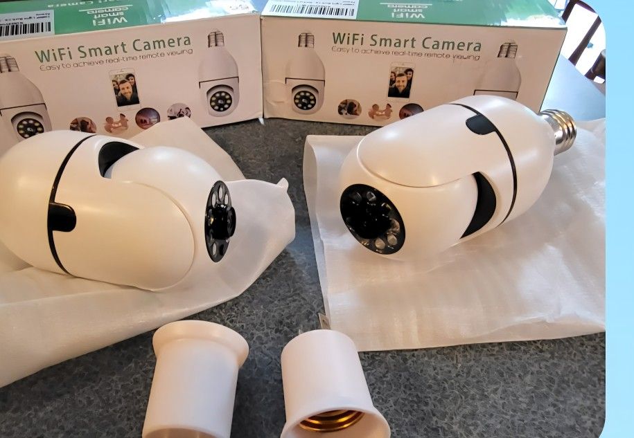 Two Wi-Fi Smart Cameras Light Bulbs Or Plug In Use, Rotating, Phone Controlled. SD Card Light And More Functions