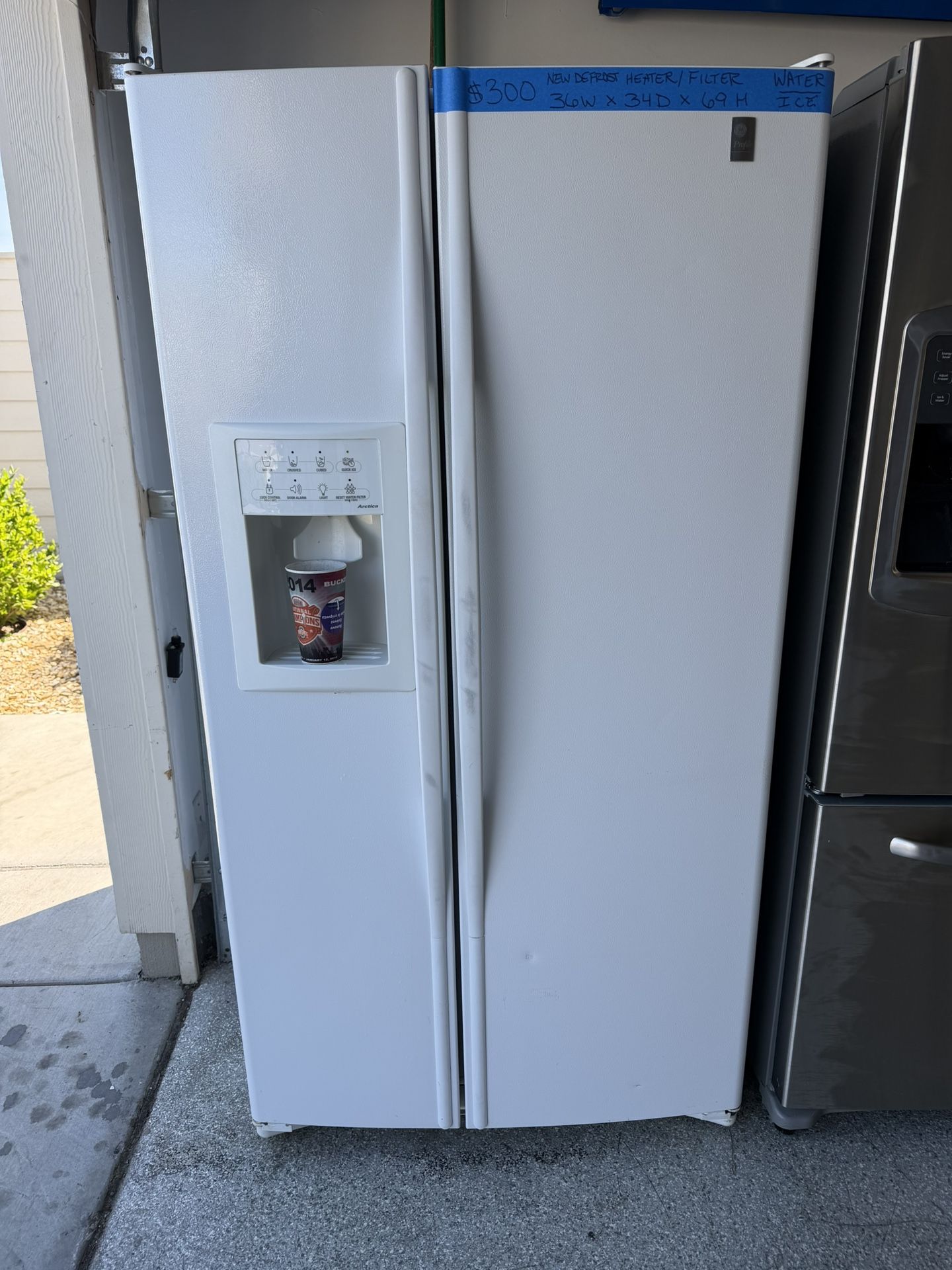 White GE refrigerator and good condition. Looks good on the outside very clean on the inside as a brand new water filter. I have installed a brand new defrost heater. It’s in good condition water and ice work sizes 36 inches wide by 34 inches deep, including the handles by 69 inches tall can deliver for a fee comes with a 30 day warranty with no refund.