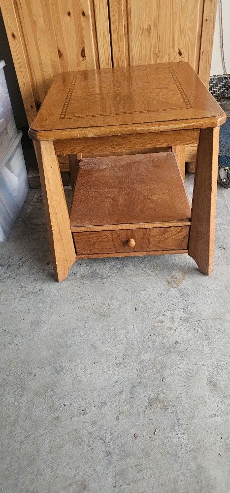 Wood table with detailed inlay on top, with drawer at the bottom.