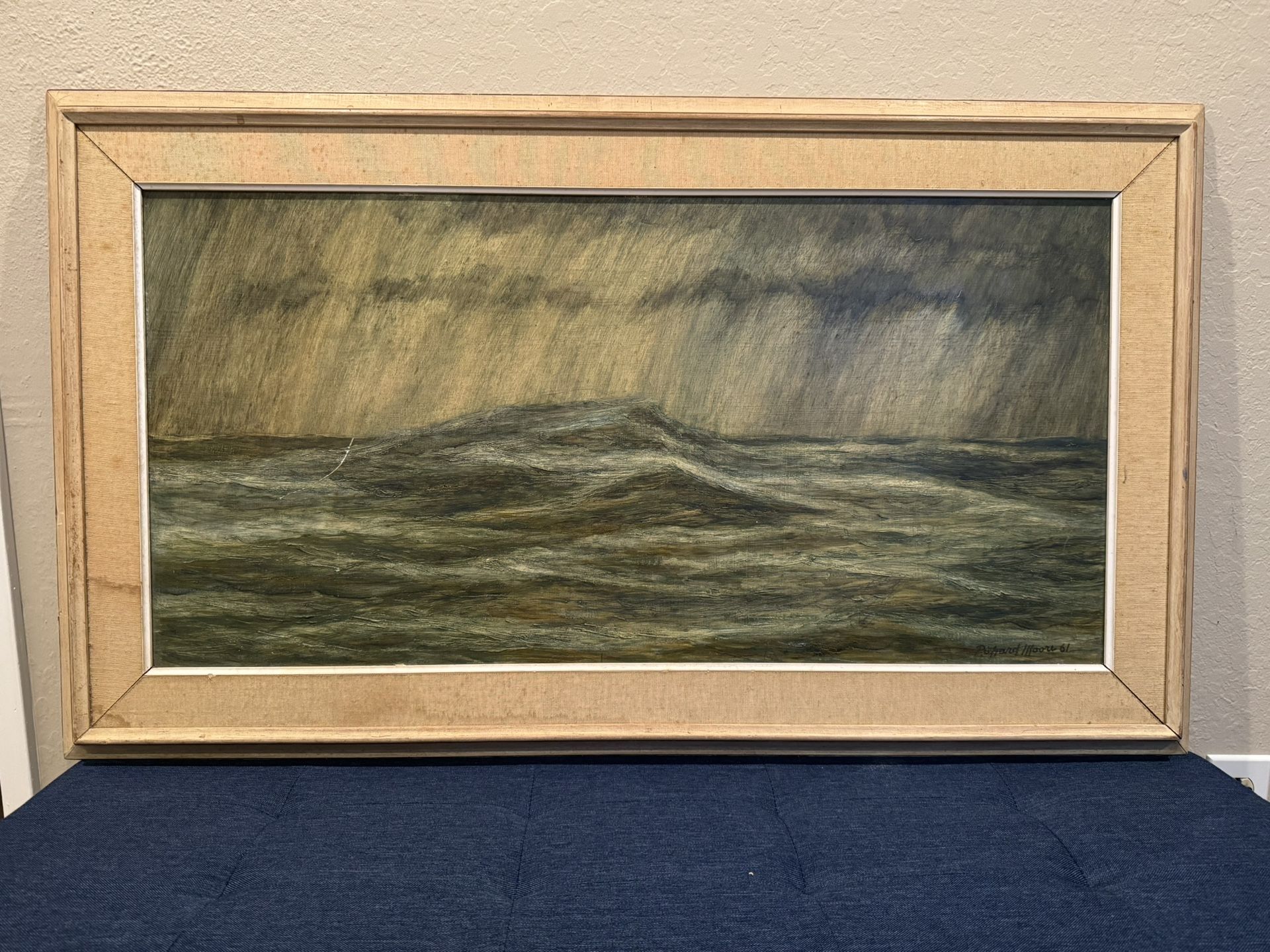 Overview: Up for sale is an incredible moody, nocturnal seascape oil painting on board by Los Angeles artist, Richard B. Moore. I haven't found much information on Moore, but he appears to have been active in the 1(contact info removed) range, which is when I would estimate this piece was created. It is signed at lower right. Artist's business card is affixed to the back of the frame. It is a tremendous, moody piece that would look great in any art collection. Framed in a simple wood frame with linen matting. Condition: Painting has a large scratch to the left of center, as well as a few paint flecks. Matting shows quite a bit of foxing. Measurements: Painting measures 36 inches wide x 18 inches high. Frame measures 43 inches wide x 24.75 inches high.