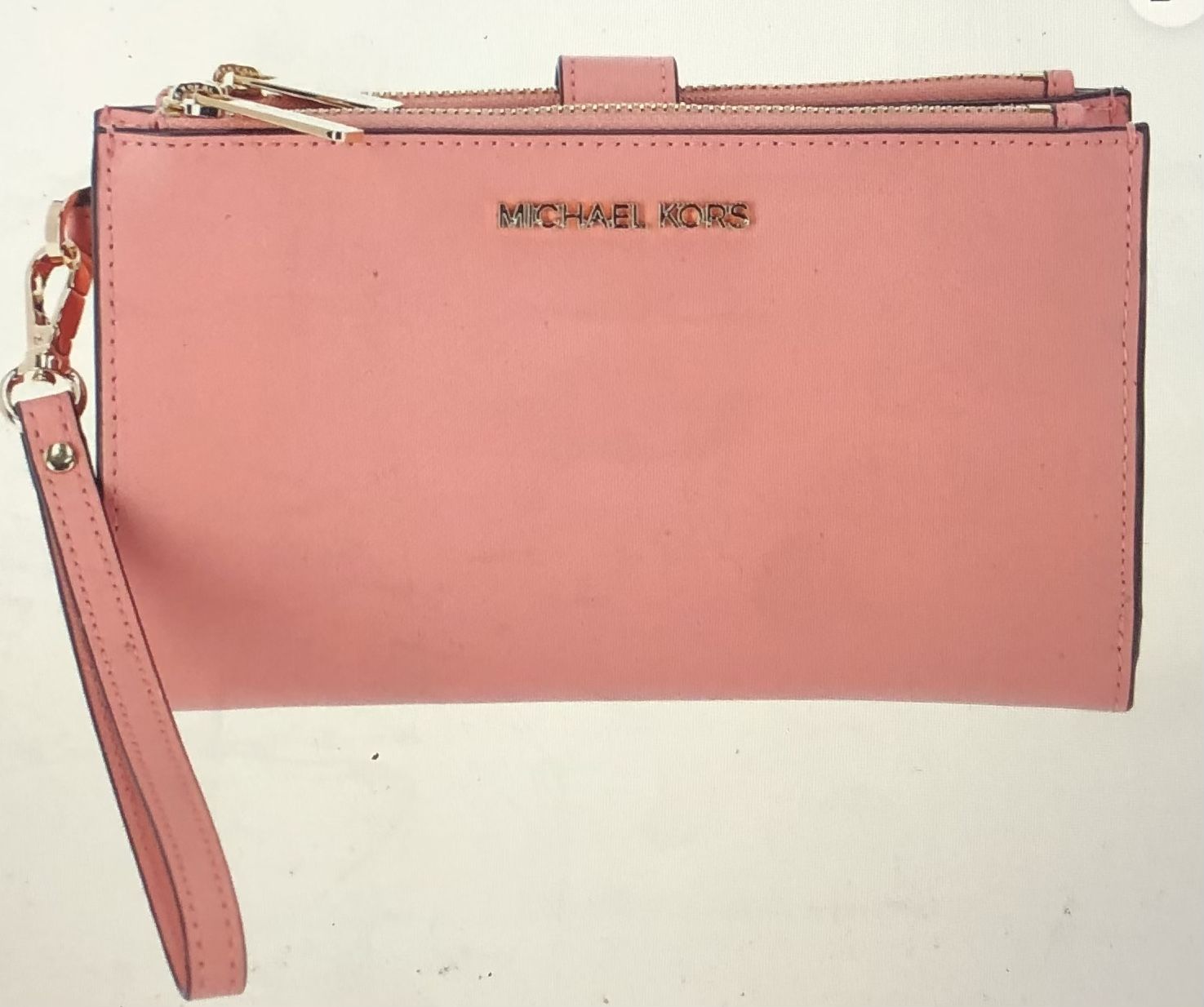 Selling new never used still tags pink primrose leather wallet double zipper 1 large billfold 1 phone case slot with secure button closure 1 window ID slot 6 credit card slots & 2 multi purpose slot compartments inside Michael kors lettering gold front logo center 7.25W” x 4.5” H x 1” D w/7” removable wristlet strap really nice look & durable