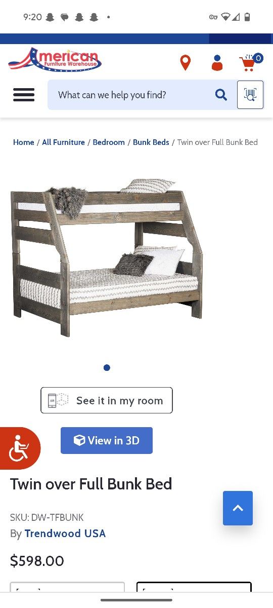 Bought less than a year ago. In great shape. Heavy solid wood bunk beds with full on the bottom and twin on the top. We can include the twin mattress, not the full one. Bought from American furniture warehouse for $598 (listing attached) .... Motivated to sell. With twin mattress asking $225