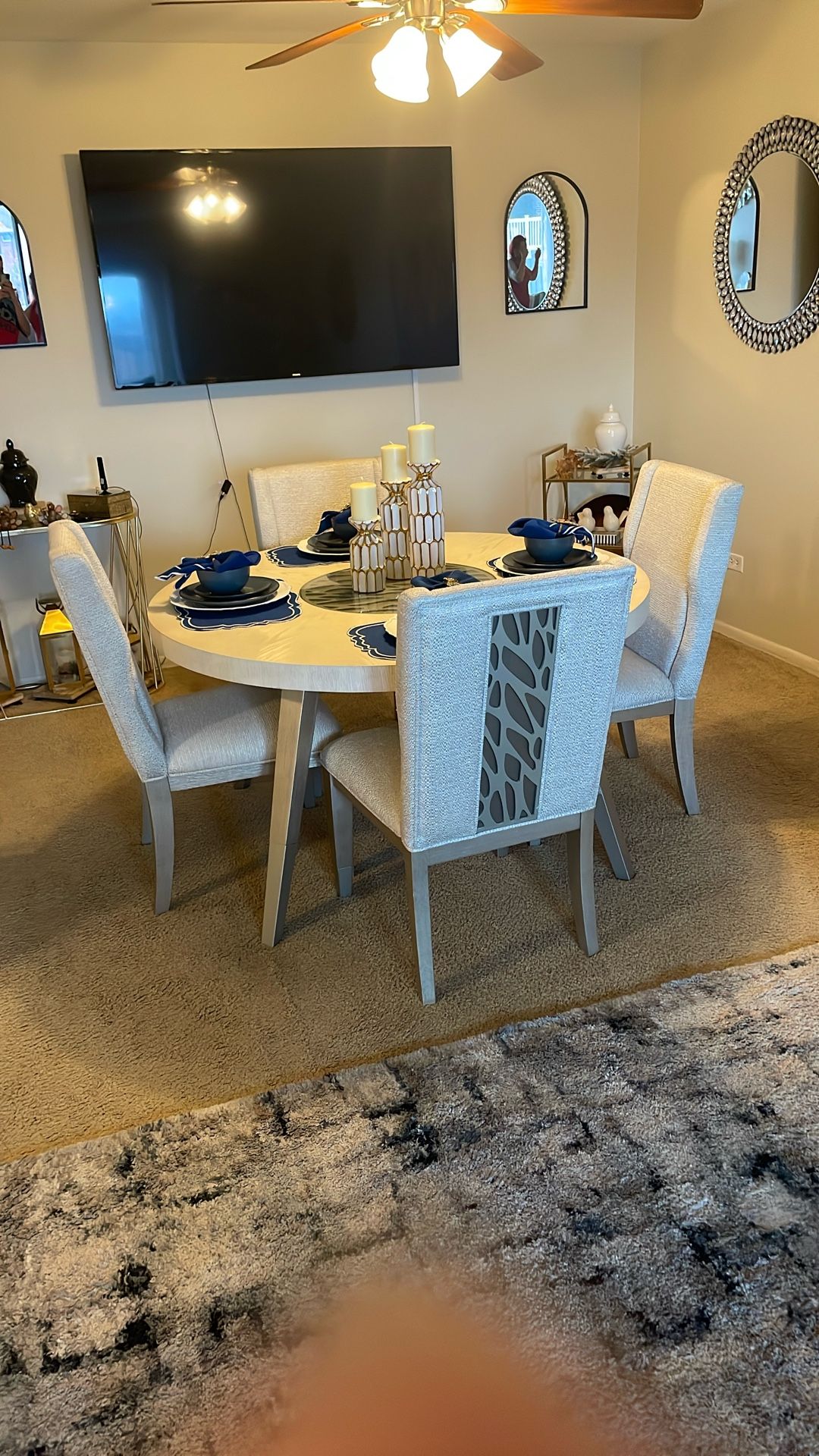I bought this set from value city for $1,500 couple months and my offer is $800 dollars Decoration is not included color de table and chair is pearl heavy table, and chair