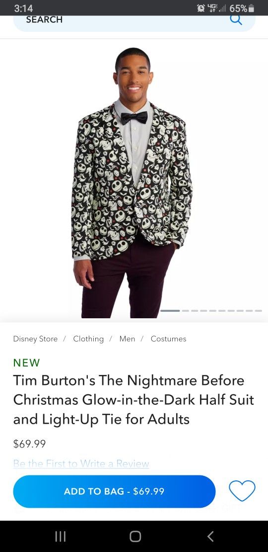 New with tags disney glow in the dark suit jacket Size S/M.. i use Large shirts and it fits me snug Try before you buy.. nice for a Halloween party Goes for 70 plus tax.. selling for 60obo