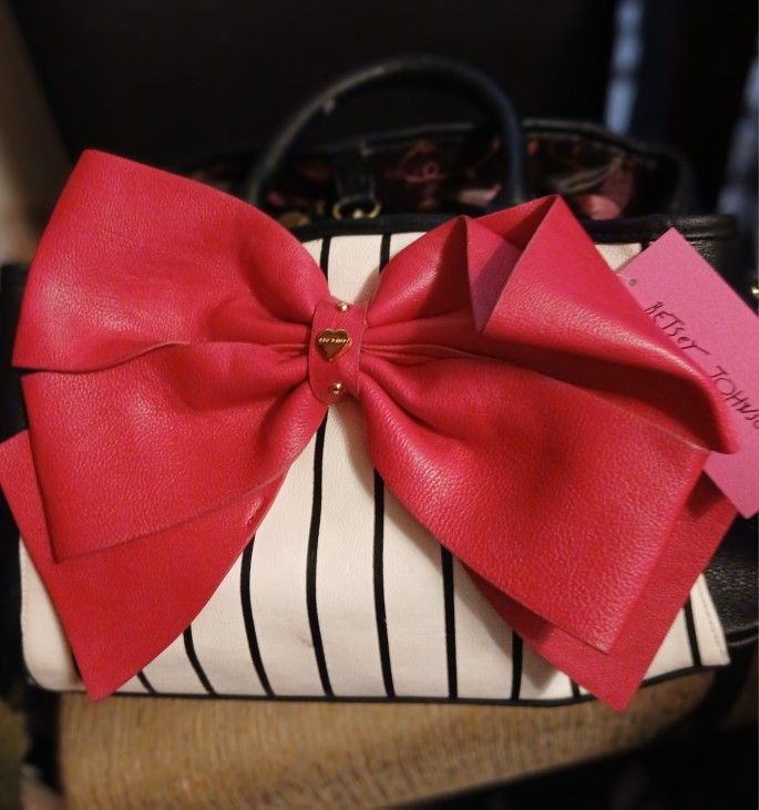 Large handbag, white with black pin stripes, large pink bow secured on front. New with tags.
