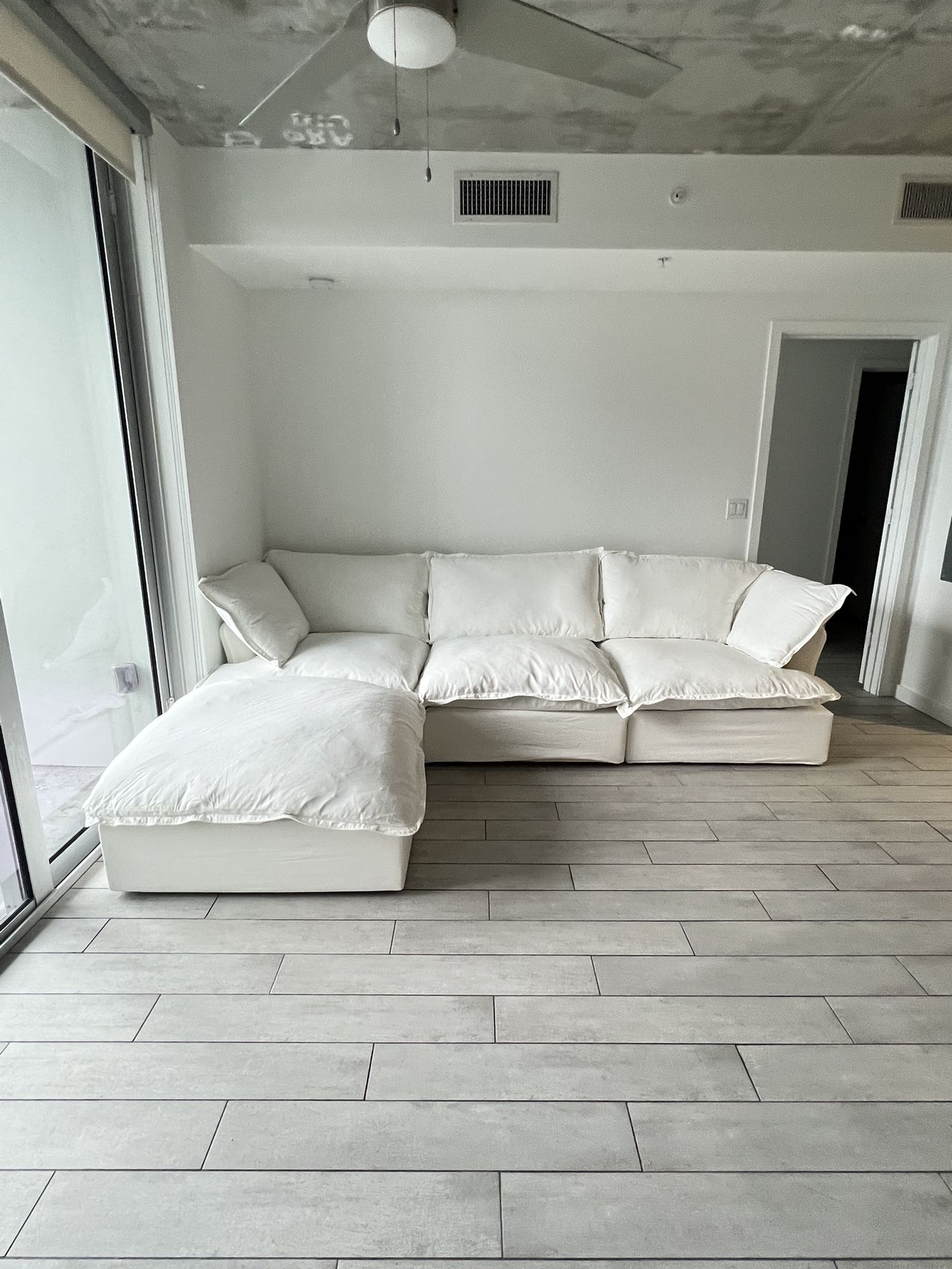 Completely Brand new! Lounge in this beautiful & comfortable cloud sectional today. Colors in White, gray & beige Features: •Modular •Removable covers to wash •Built in storage in ottoman •Base covers can be washed We offer delivery & assembly! Dimensions: 120 inch wide 80 inch chaise