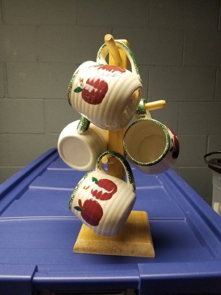 4 coffee mugs with apple design and wooden stand