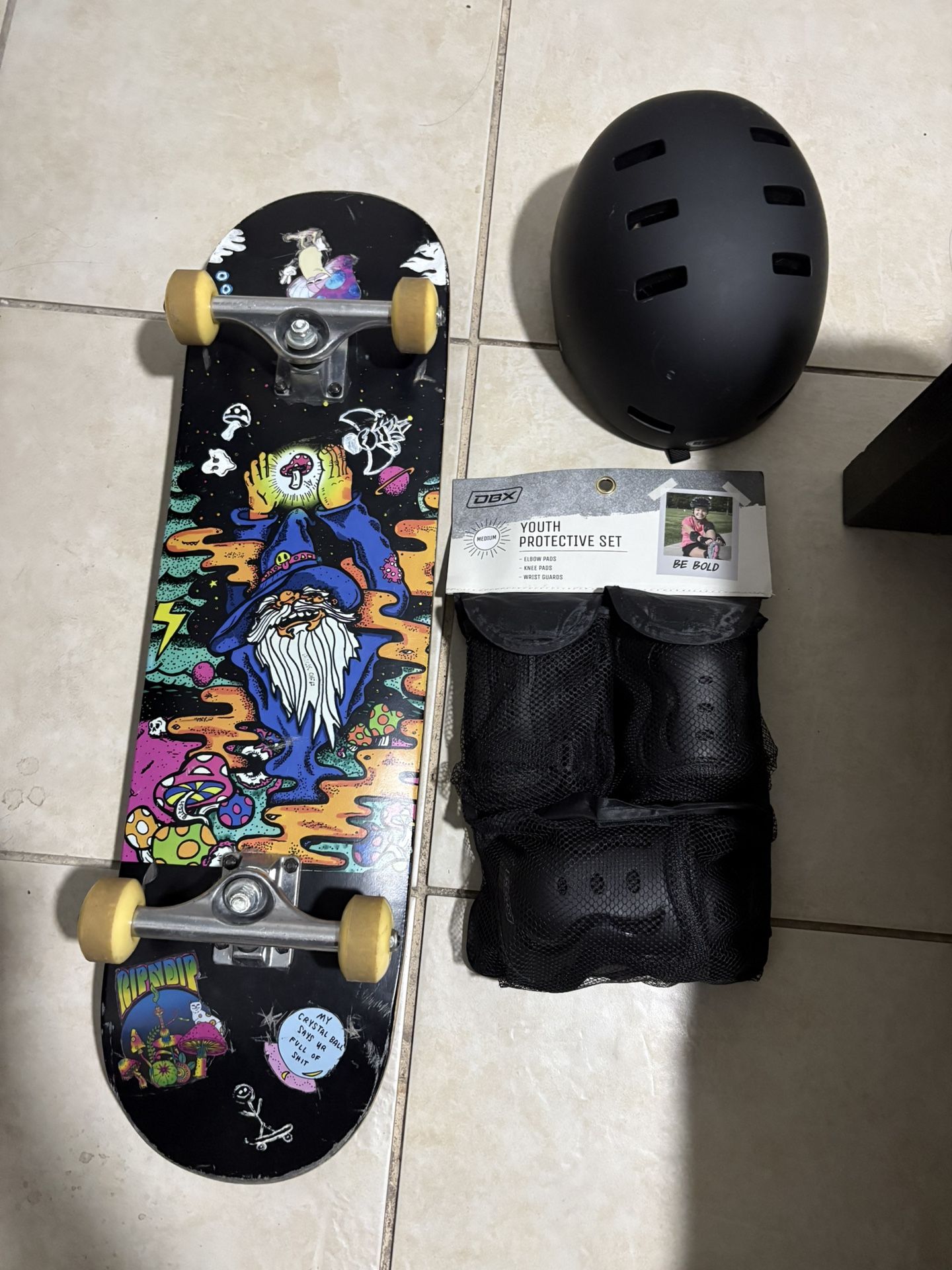 Skateboard Length: 31 inch Width: 8 1/4 inch Protectors Helmet Size M