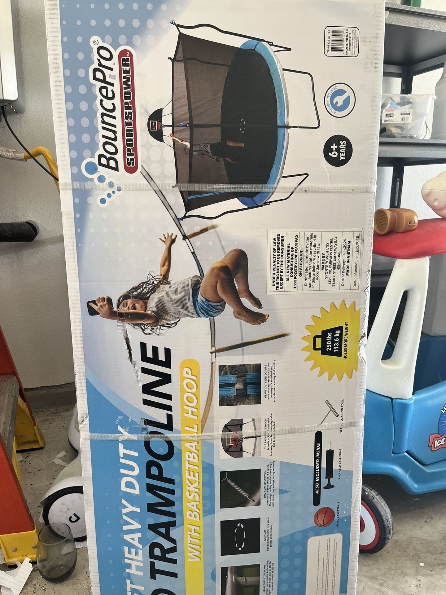 Brand new (never opened) trampoline, comes with basketball, Ball Pump and spring loading tools , the price is negotiable if fair