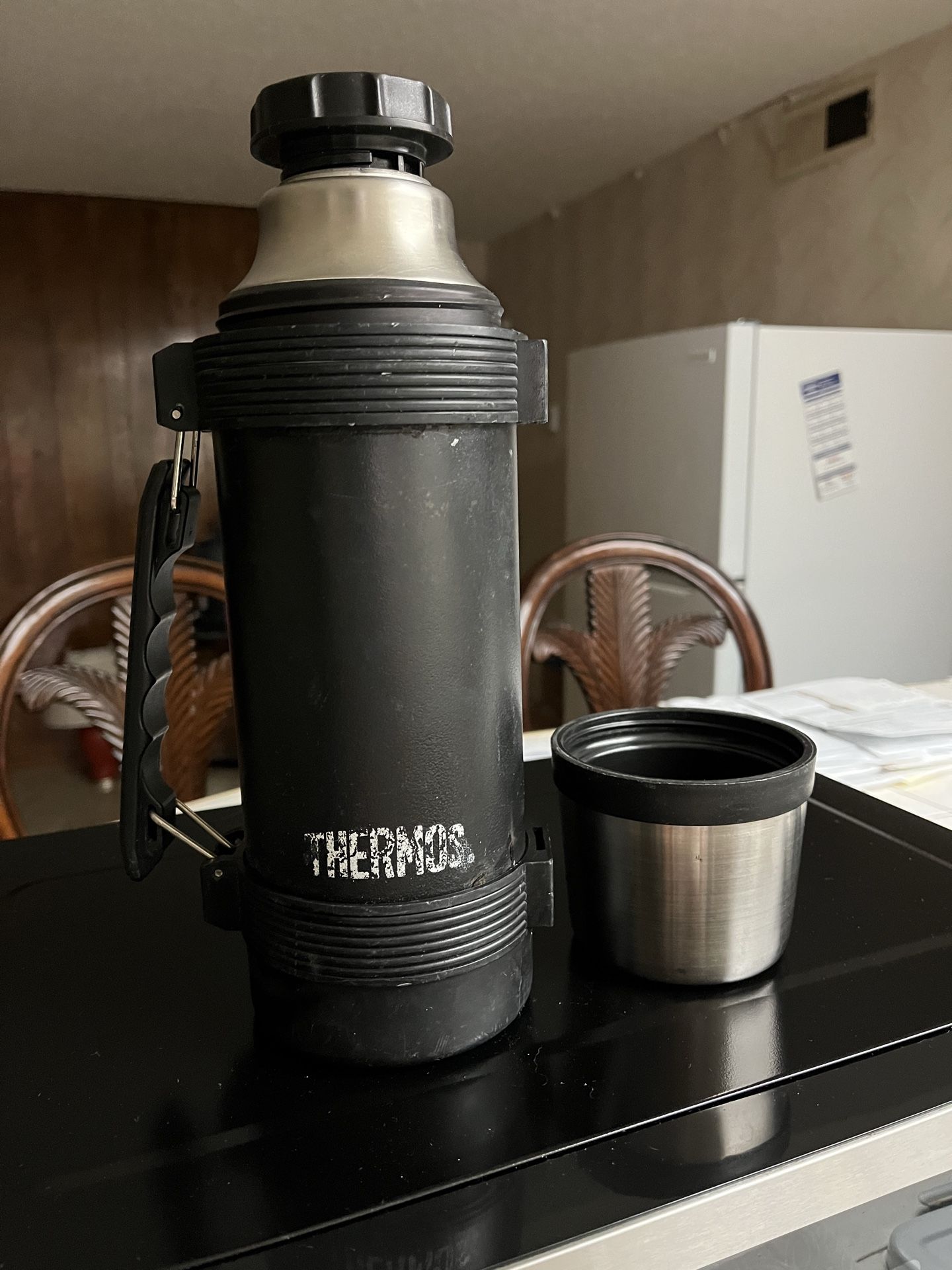 Classic Thermos insulated bottle with screw-on cup lid. Great for keeping drinks hot or cold for hours — perfect for work, camping, or road trips. ✔️ Stainless steel interior ✔️ Includes cup/lid ✔️ Folding handle for easy carry ✔️ Large capacity