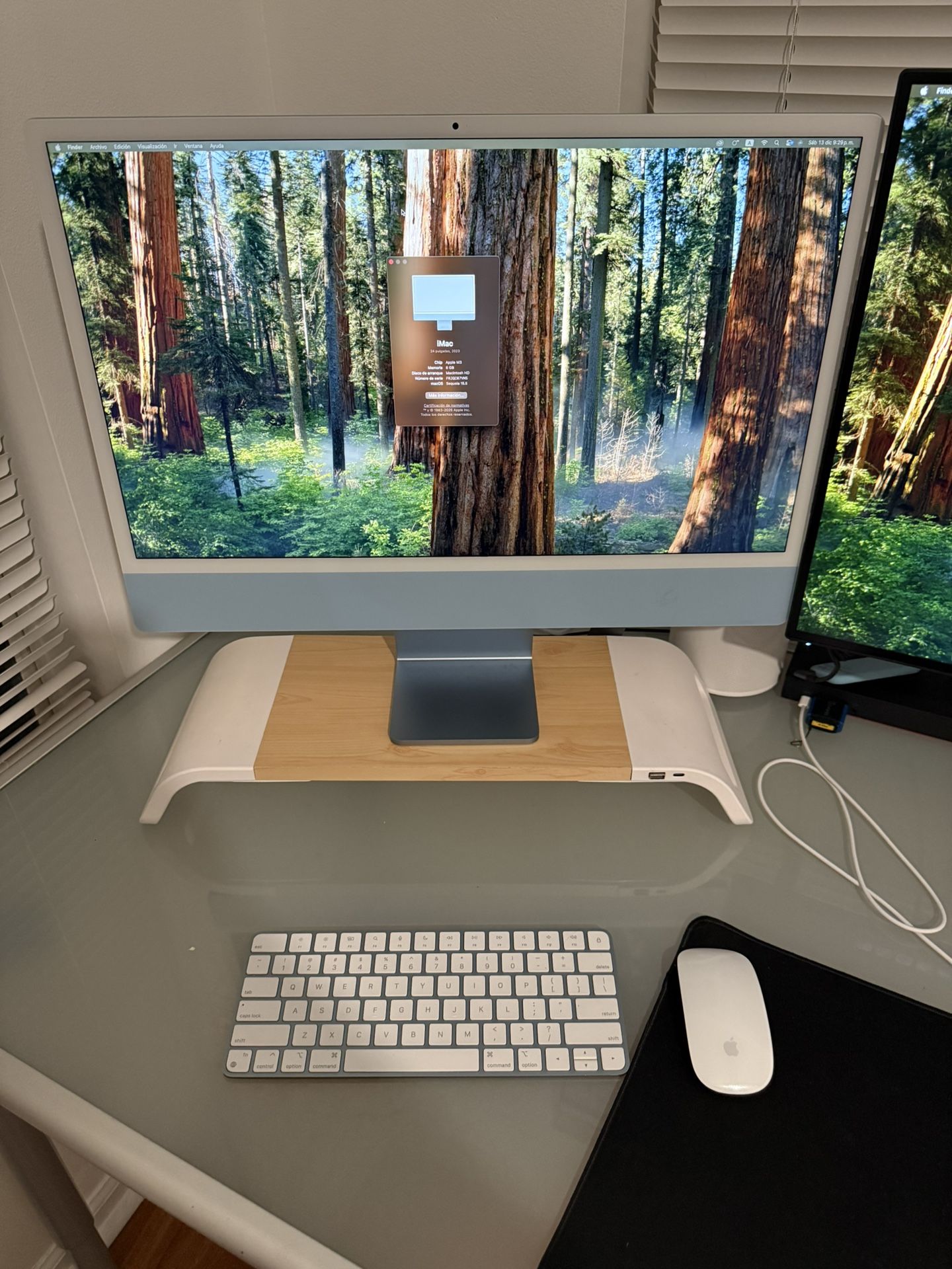 Blue iMac M3 24-in, 8GB RAM, 256SSD, Comes with matching keyboard, mouse, and power cable.