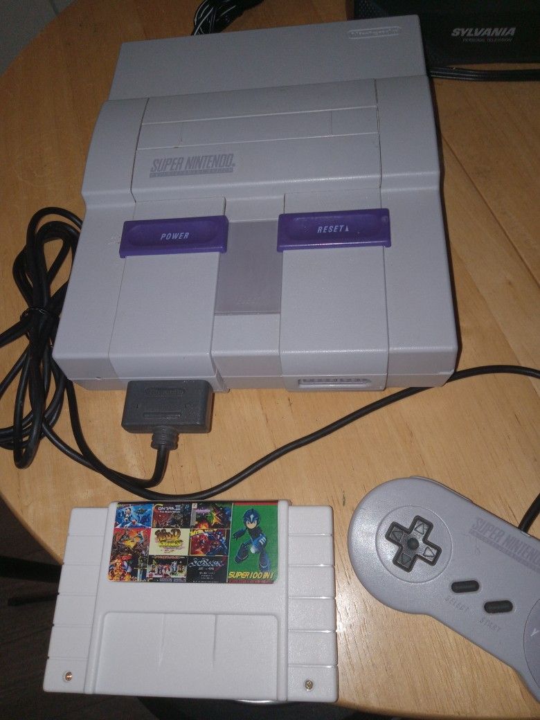 Super NINTENDO with 100 Multi Cart Cartridge. Comes with one original controller and all cables. System itself in physical good condition with one small chip on corner(see picture). But stored inside.. look at the nice color of the console! Multi Cart has 100 awesome games! Everything for $110 NO LESS NO LESS CASH ONLY Playstation Xbox Sony Xbox