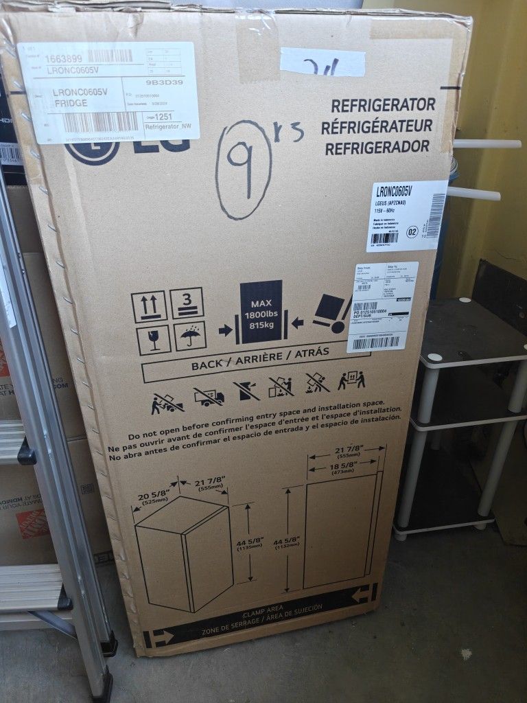 Brand new in the original packaging box. Never opened. See specs at https://offerup.com/redirect/?o=aHR0cHM6Ly93d3cubGcuY29tL3VzL3JlZnJpZ2VyYXRvcnMvbGctbHJvbmMwNjA1di1zaW5nbGUtZG9vci1yZWZyaWdlcmF0b3I= Local pickup only.