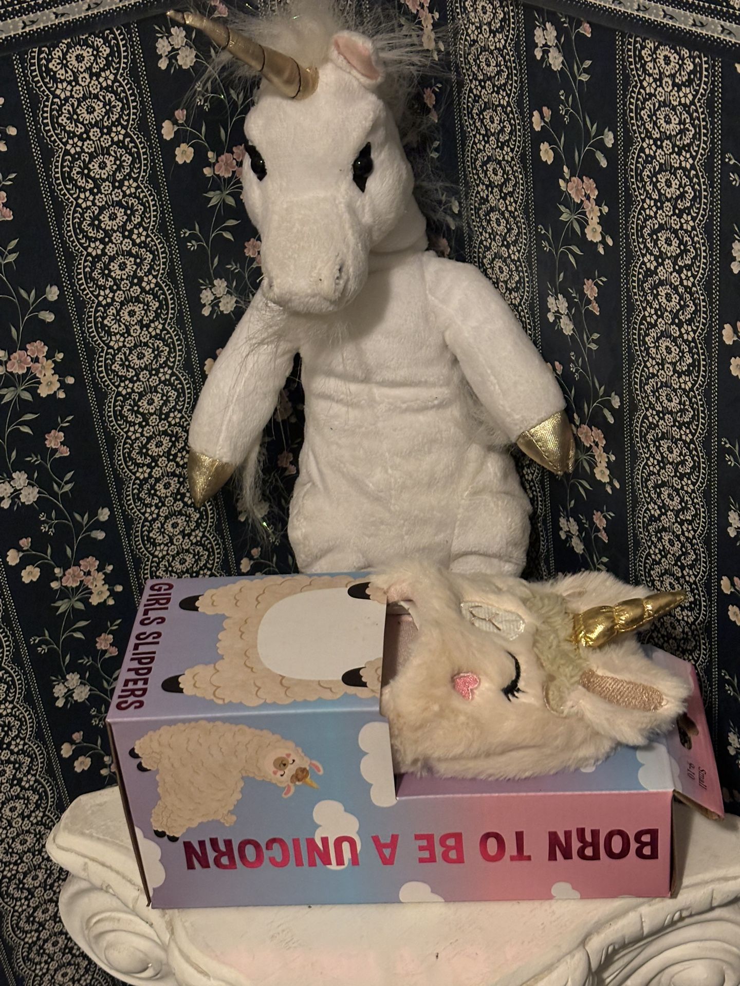 Unicorn doll and brand new slippers size small 9-10 PICK UP ONLY! CHECK OUT MY OTHER OFFERS!!