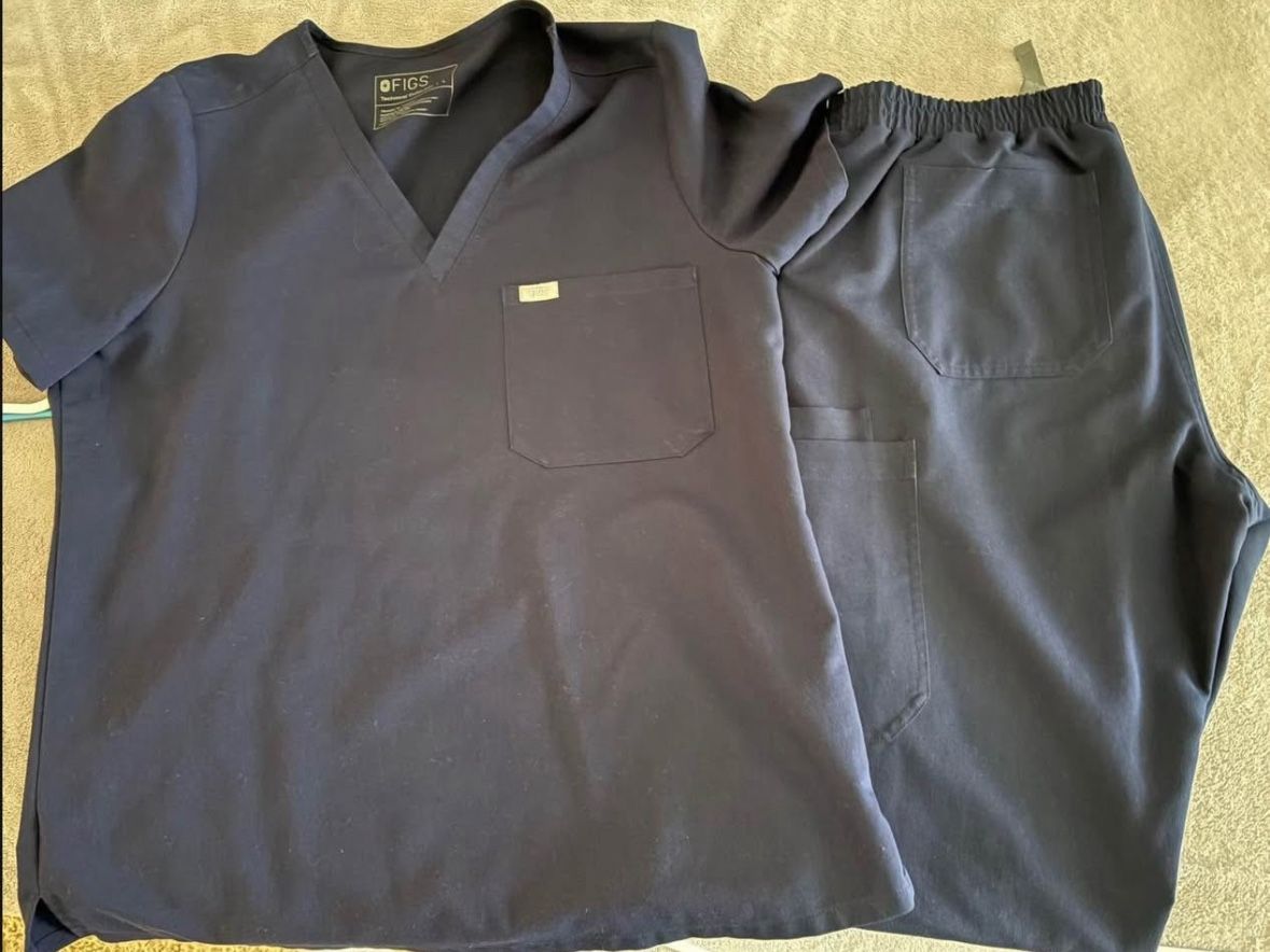 Women’s scrubs size large sets- all tops Catarina one pocket top, pants are all yola skinny leg scrub pants Navy blue