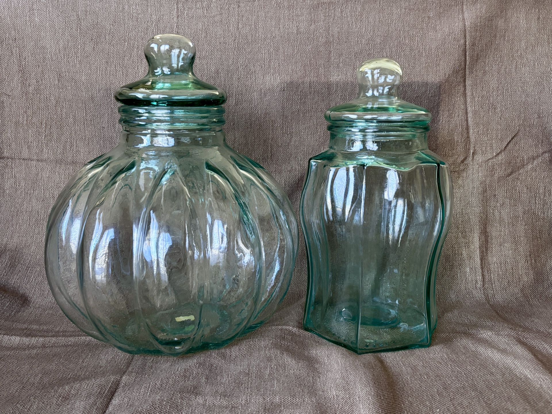 Set of two extra large green glass cookie jars with lids. Thick, heavy glass with ribbed design. Great for kitchen storage or display. Large jar: 16”H x 12”W Tall jar: 15”H x 8”W Both in great condition. Pickup only. Located in NW Albuquerque.