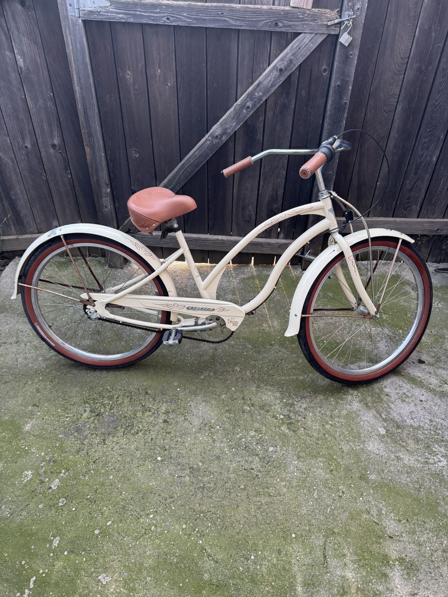Electra Cruiser Bicycle, steam ride series, Twiggy. Bike rides excellent. Tires hold air, chain is rusty and seat is a little loose. DESCRIPTION Frame Material: hi-tensile steel Frame Angles: Unspecified Sizes: womens 17" Colors: Cream, Matte Purple Fork: Electra Rear Shock: Not applicable Brake Levers: Not applicable Handlebar: steel Stem: steel Headset: 1" threaded steel Front Der: Not applicable Crankset: steel one-piece Rear Der: Not applicable Pedals: resin body, steel cage Tires: 26 x 2.125" skinwall Delivery available