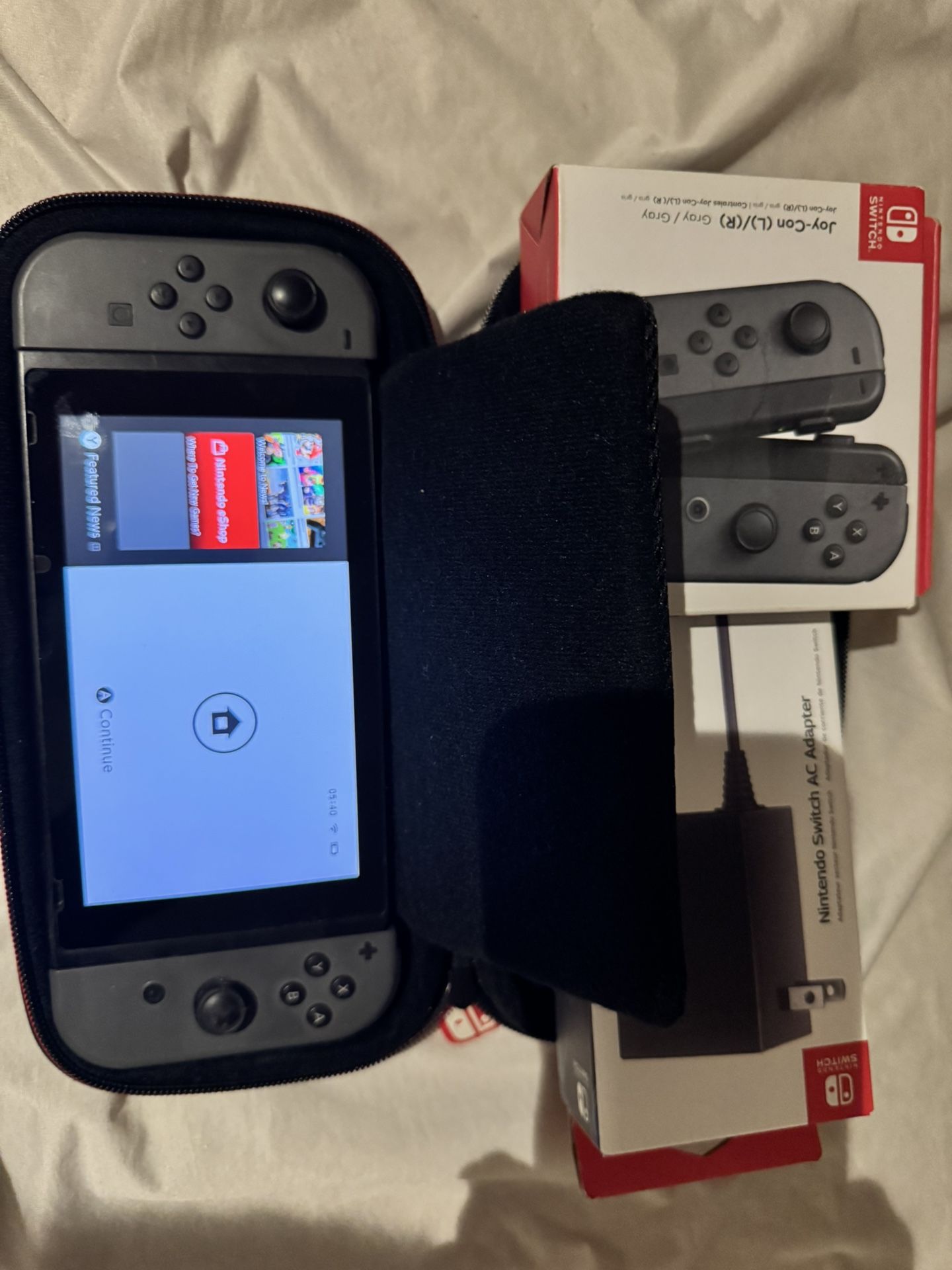 Nintendo switch. All grey in color. Works great. Has been wiped clean. Comes with carrying case Comes with an extra set of Brand new in the box joy-cons 2 chargers. 1 brand new in the box No docking station
