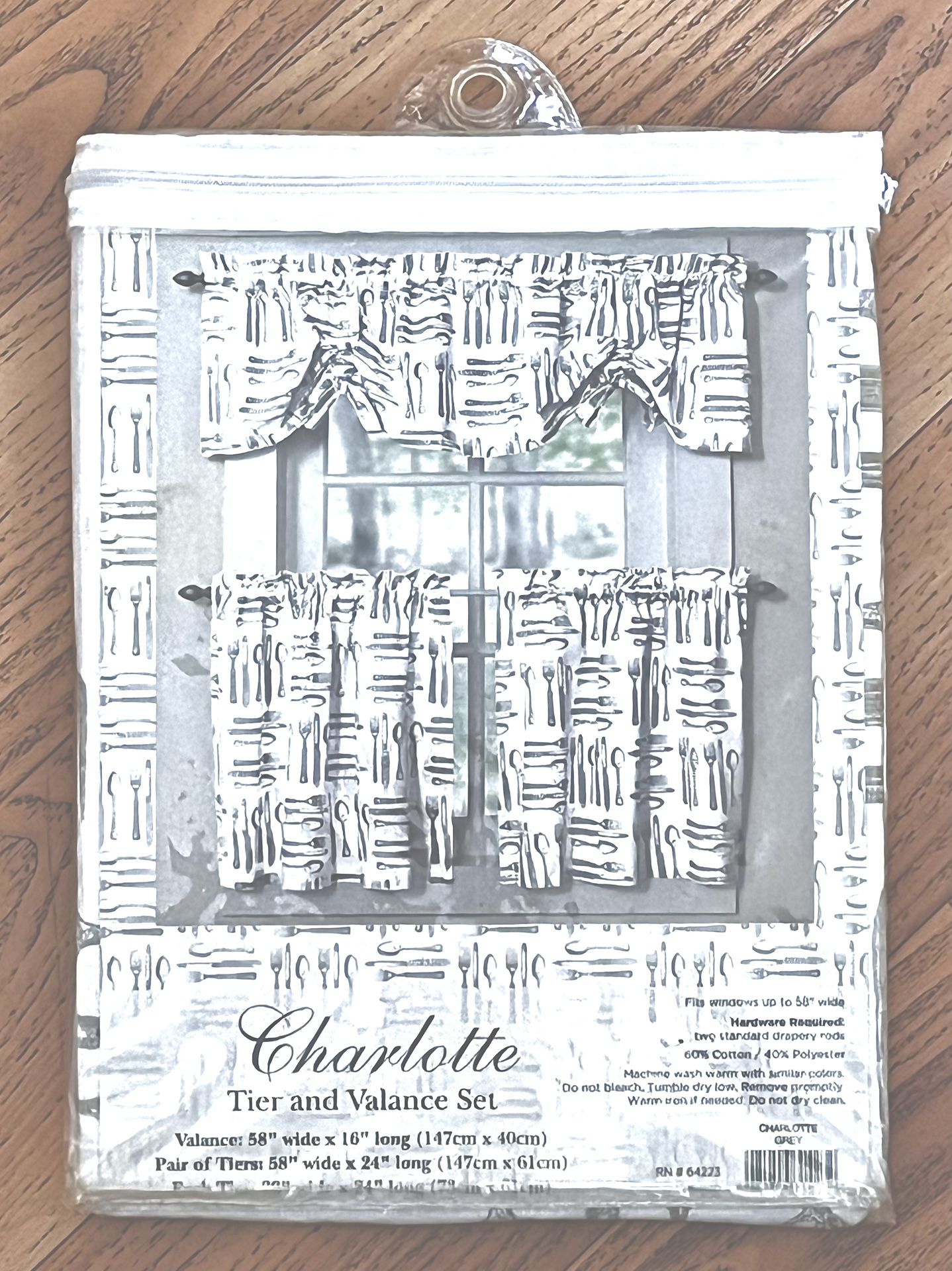 Unused in original package with $12.99 price tag from the Christmas Tree Shops. Gray kitchen utensils printed on a textured white 60% Cotton/40% Polyester fabric. Valance can be shirred as shown in photo Set includes: valance 58" wide x 16" long; pair of tiers 58" wide x 24" long; each tier 29" wide x 24" long. Price reduced to $5 for the set. (Paid $13.90 including tax years ago.) No pets or smoking in home. Free pickup in Saratoga Springs, NY. If out of area: invoice, payment and shipping of orders, totaling at least $20, through PayPal. Check out my other items; will ship together to save on postage. No holds. First come, first served. Cross posted.