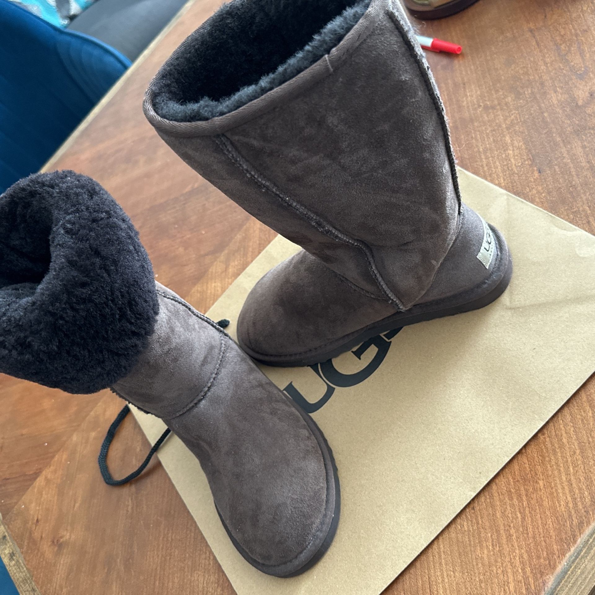 Ugga color cafes altas talla 5w, pero yo soy 6 1/2 y me quedan perfectamente, no tienes la caja pero si su bolsa, completamente nuevas. Pague 199 + taxas pido $150 obo. Recoger en Auburn