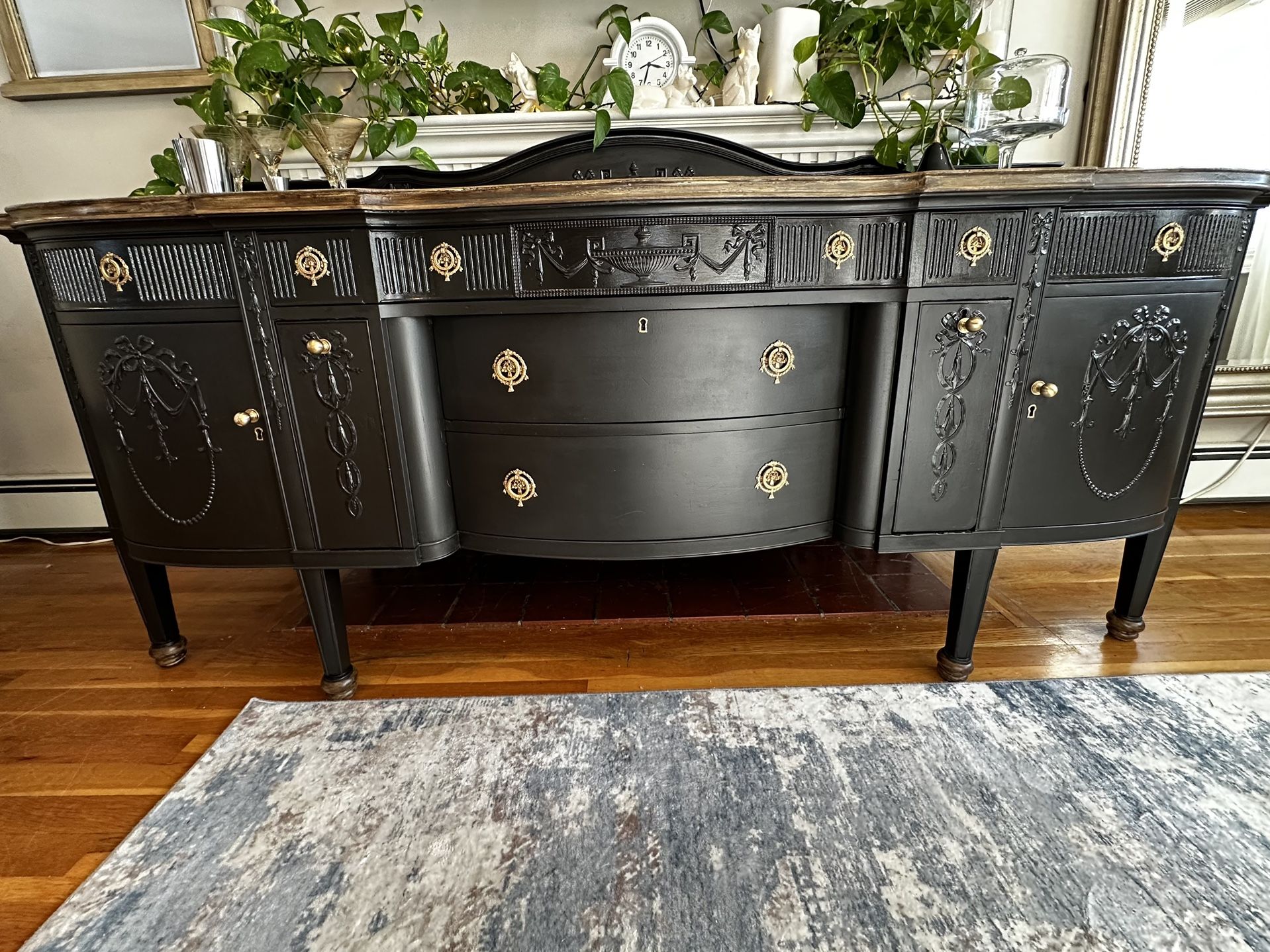 This antique piece is a Federal style mahogany sideboard, most likely manufactured in the early 20th century (circa 1900–1920). Key Characteristics Style: It features classic Federal and Neoclassical elements, specifically a bow front design with mahogany veneer. Details: The piece is characterized by elaborate relief-carved swags, floral motifs, and potentially an urn design on the backsplash. It also includes original brass hardware and reeded legs. This antique sideboard has been modernized with a dramatic a matte black finish, with a high gloss illuminating its creative carvings, creating a bold contrast against the original polished brass hardware. The refurbishment highlights several key design features: The Finish: A smooth, opaque paint has replaced the original mahogany veneer. This creates a contemporary, "shabby-chic" or French Regency aesthetic. Contrasting Top: The wood grain on the top surface has been stripped and refinished in a natural oak stain, providing a warm, organic counterpoint to the dark body Hardware: The ornate brass pulls, escutcheons, and decorative medallions have been cleaned and polished to stand out sharply against the black paint. All raw wood and interior has been cleaned conditioned and hydrated with beeswax and orange oil. Architectural Details: The dark paint adds depth to the relief-carved swags, floral motifs, and reeded detailing on the legs and cabinetry, making these neoclassical elements more prominent. This is a beautiful piece, perfect and its imperfections. All draws and cabinets work properly it has original skeleton key, locks are in working order. It highlights two pull out drawers to hold bottles. Measurements Depth is 23 inches Height is 36 inches to the top of the table an additional 9 inches for the backsplash brings it to a total 45 inches high . 78” long