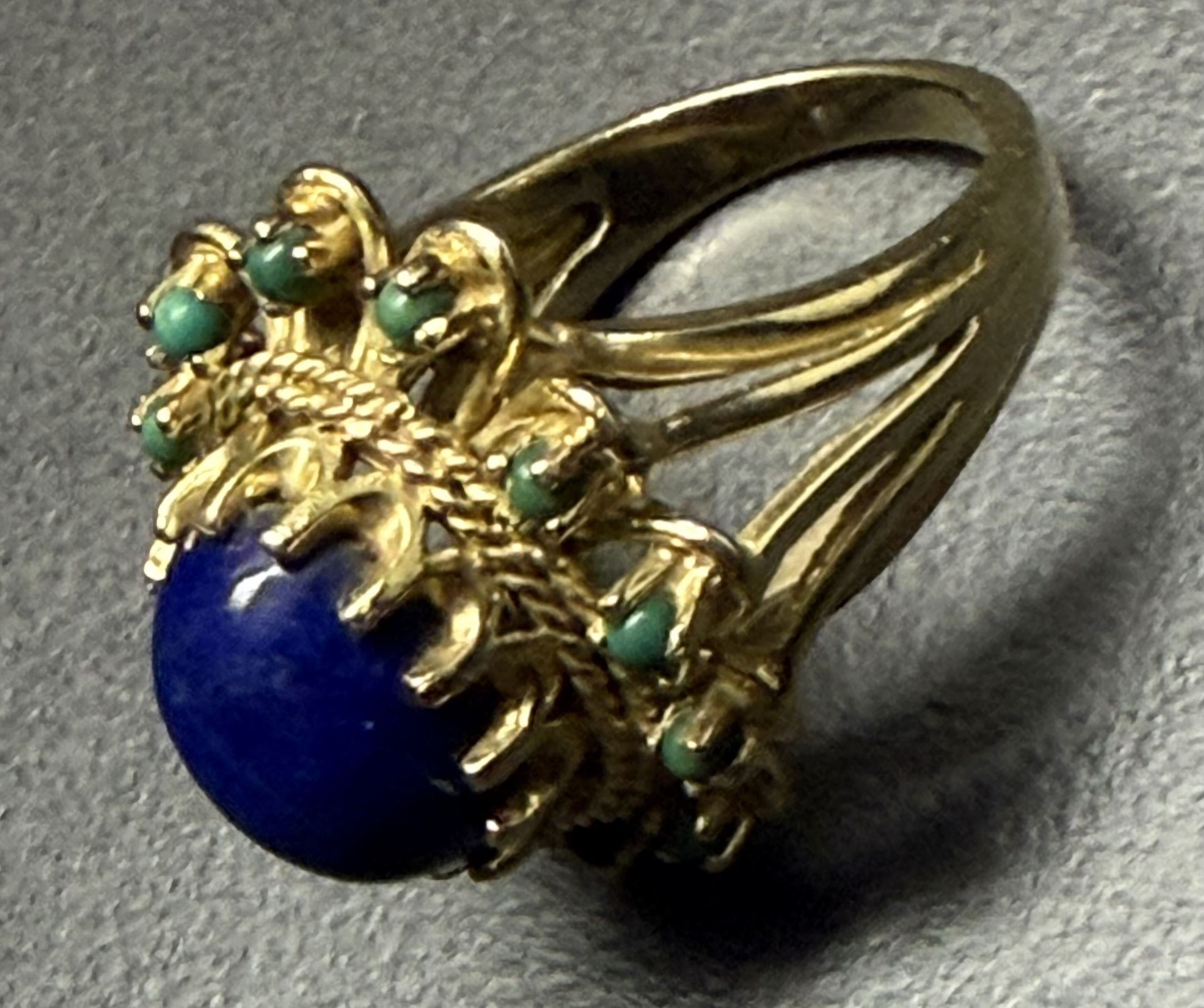 This item is a vintage-style cocktail ring featuring a large, central oval lapis lazuli cabochon surrounded by smaller turquoise stones set in 14K gold.