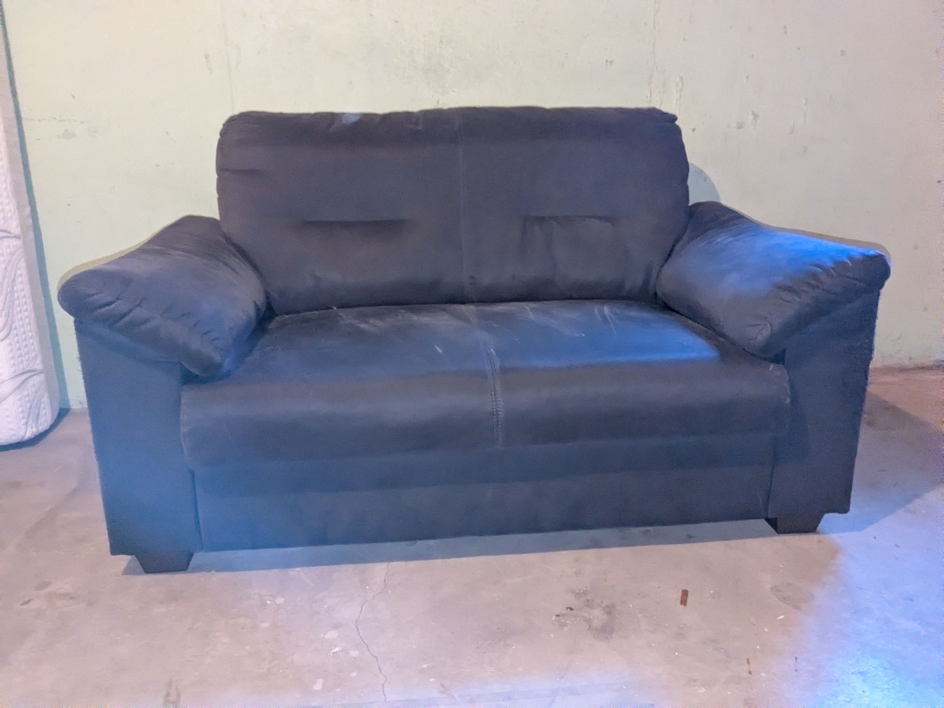 Ikea Couch in navy blue. Can fit two people, will definitely need to be cleaned due to cats. Has damage on sides due to cats. Height: 34 inches Length: 59 inches Depth: 35 inches