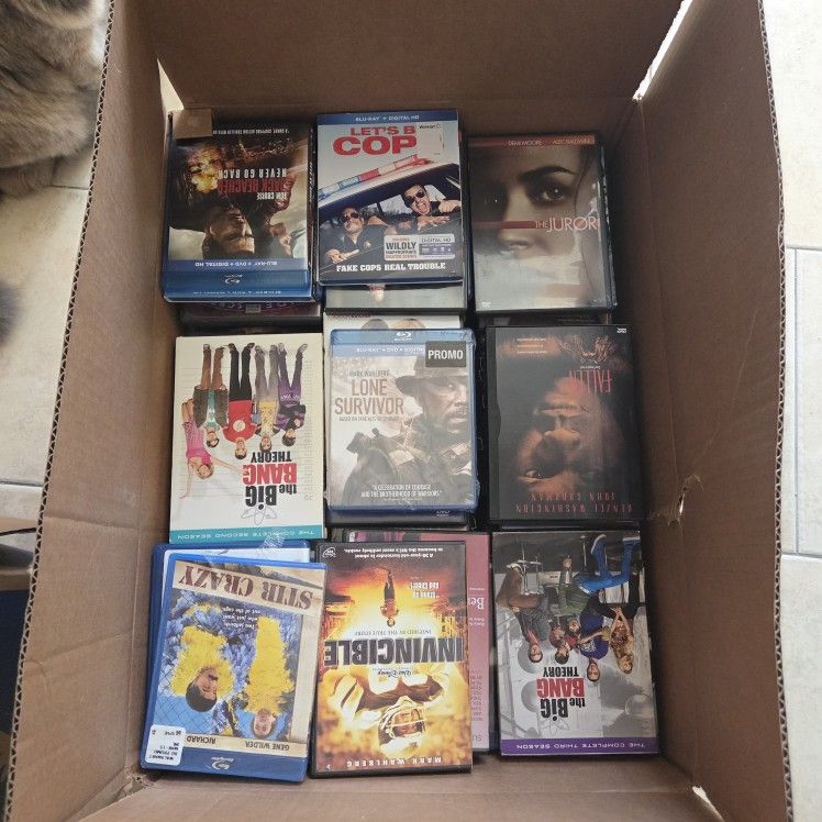 A 24x17x12 box of blu-ray, dvds for sale. Quick rough count of approximately 145-150 disc's including some series seasons. Take entire box for $75.00