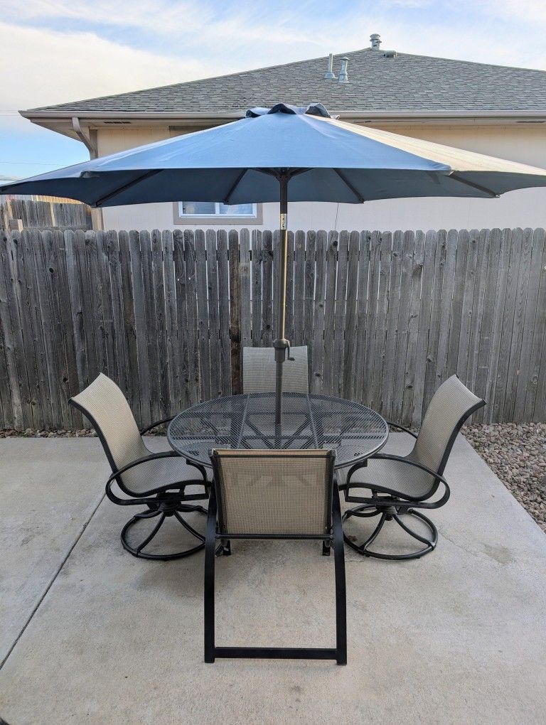 Wrought Iron Patio Set. Includes: •Wrought Iron Circular Table (48" Diam.) •4 Chairs •Large Umbrella Chairs have an outdoor fabric weave, in great shape. 2 swivel chairs, and 2 static chairs. Table is sturdy wrought iron, also in good condition. The legs fold up for easy transportation. Delivery available to Denver area for a fee.