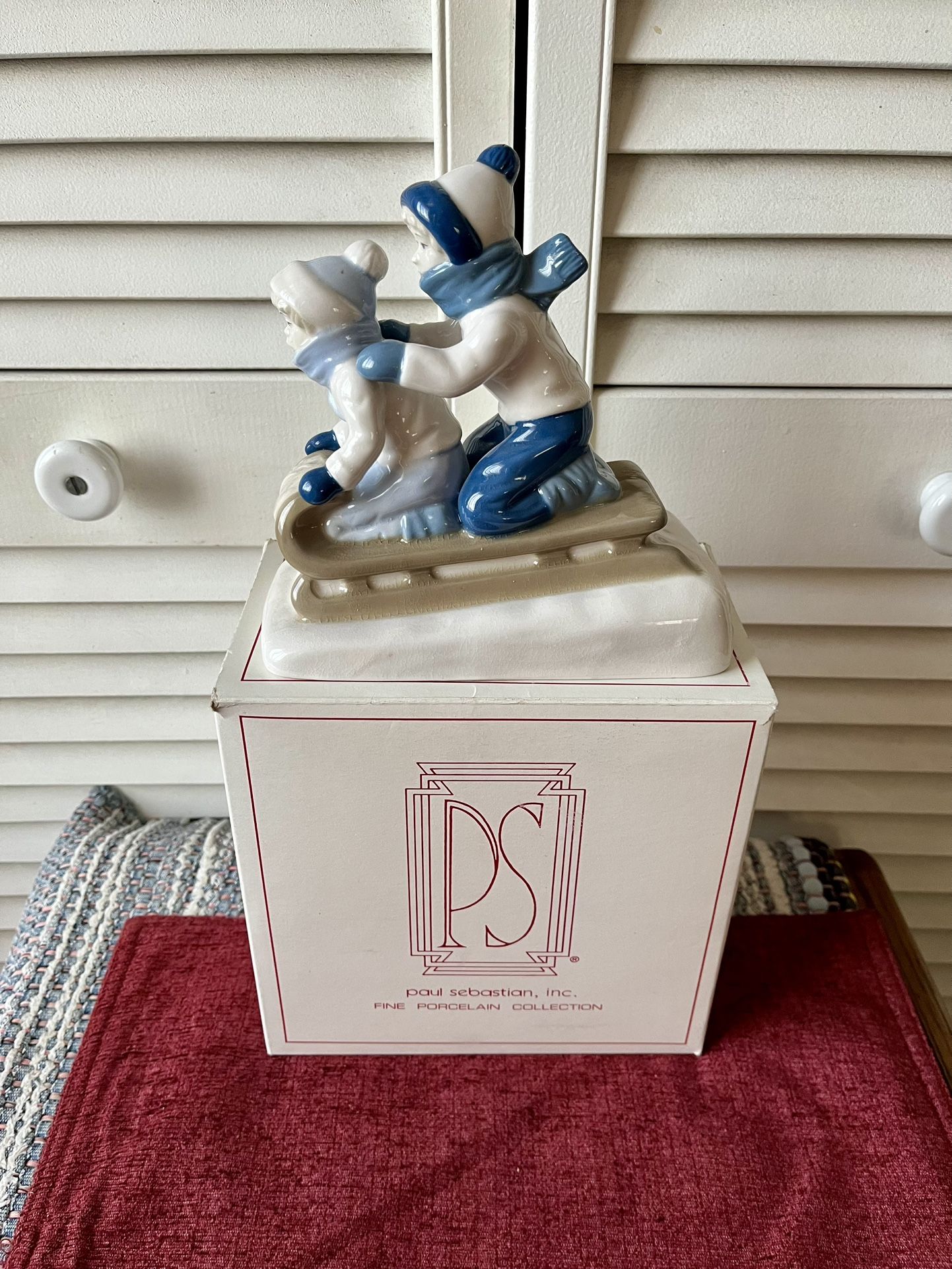 1992 Paul Sebastian PS Collection Children Sledding Porcelain Figurine New w/Box