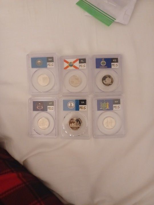 6 Assorted State Quarters With Flags Coins are 20$ Each 2000 S New Hampshire 1 2000 S West Virginia 2 2001 S New York 1 2004 S Florida 1 2005 S Kansas 1 2007 S Utah 1 Choose which coins u like Discount for 4 or 5