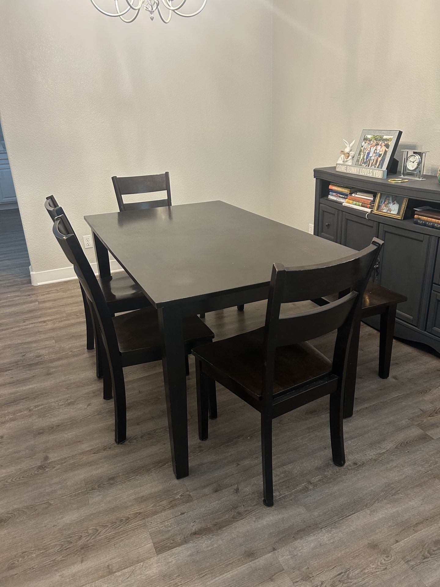 Used dining table that seats 6. There are a few spots on the chair and table that show wear and tear but overall, in decent condition.