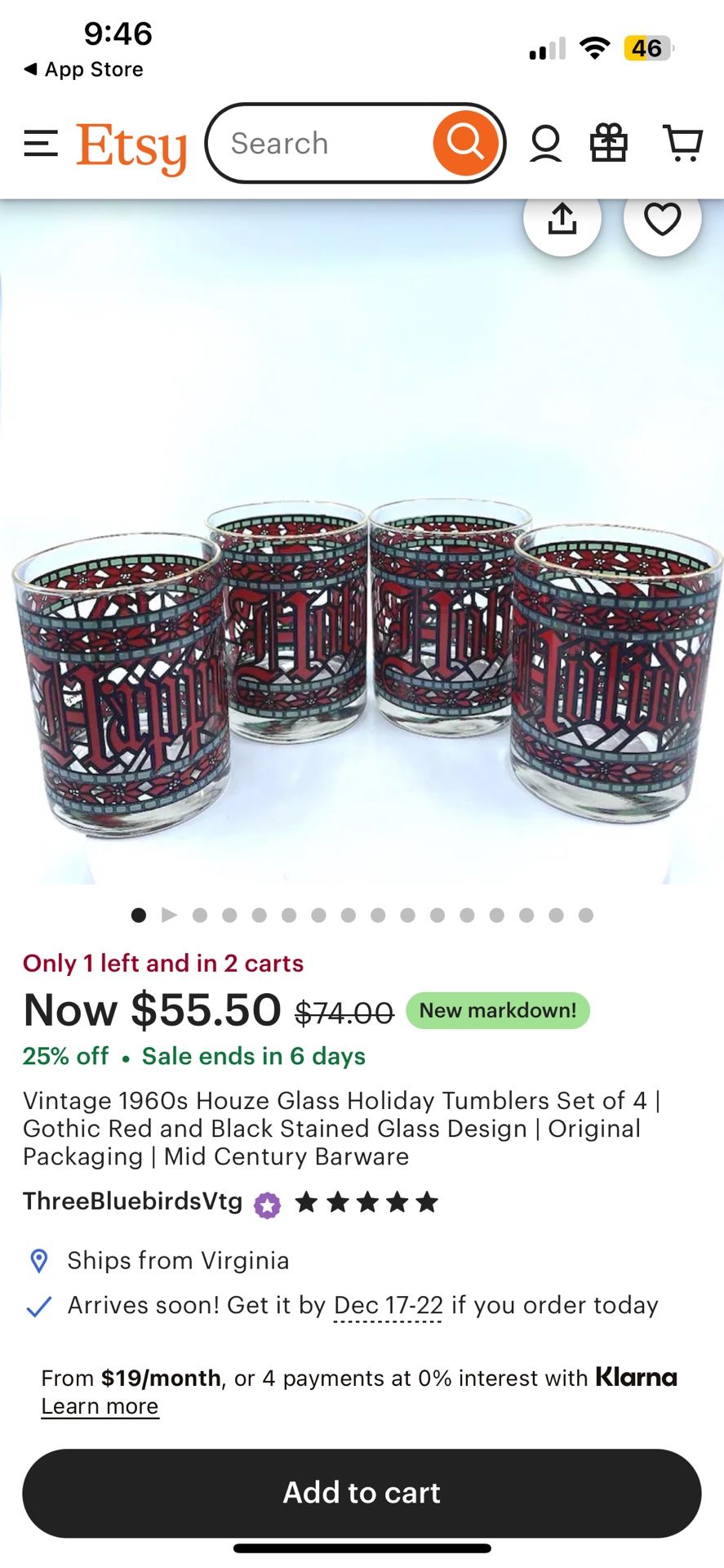 Each glass is designed with a stain glass look of poinsettia and holiday wishes. The rim is beautifully trimmed in gold. The base has a nice weight and the glass has a good hand feel. Measures 4 1/8” tall, 3 1/4” diameter. All are in excellent condition.