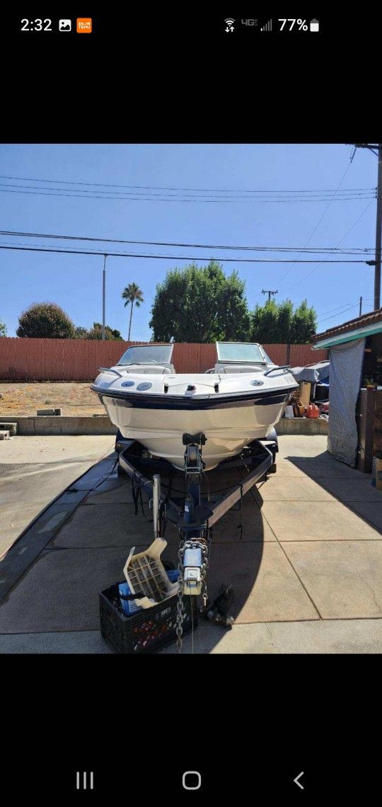 Mercury-In board-out board, sterndrive motor, Strong powerful motor engine 5.0 leader, 8 cylinder ,220 horsepower, fresh and salt water capabilities, length 20 feet, built and bought 2004, weight 3,501. Attributes : 1 Slow speed stability 2 fuel economy 3 hull design efficient canvas bimini top, hull fiberglass, under 50 motor hours, minimum usage, comes with trailer Registration 2024 new battery weathered backseat/engine cover rub rail tip dinged Fairing tip passenger side