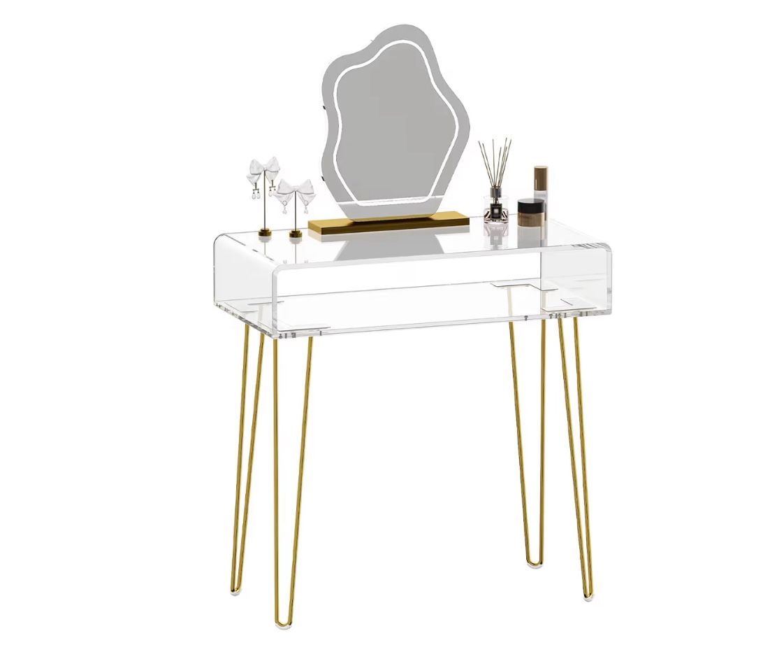Eglaf Acrylic Vanity Desk - Small Makeup Vanity Table - Dressing Table for Bedroom, Dressing Room, Large Storage Space, 31.5'' L x 15.7'' W x 32.1'' H, Gold Metal Legs Color Gold Size Gold Material Acrylic Product Dimensions 31.5"D x 15.7"W x 32.1"H Style Modern Furniture Finish Smooth High-quality Material - The makeup vanity is made of transparent acrylic material, smoothing all over, waterproof, durable, and easy to clean and use. Modern Elegant Style - This vanity desk uses a simple and clear design, compatible with various home styles, providing a sleek and modern addition to any dressing room area. Excellent Vision - Acrylic Vanity offers a hollow-out large storage space for your makeup items, accessories, or office supplies, all at a glance. Overall Size of 15.7'' L x 31.5'' W x 32.1'' H for any room layout. Versatile Usage - It also can be used as a dressing table, writing desk, makeup table, computer desk, study desk, and porch table offering functionality and aesthetics in one piece of furniture. Easy to Install - Come with installation tools and accessories in the package, just need to follow the instructions to install them in about minutes. (NOTE: Dressing mirror not included)