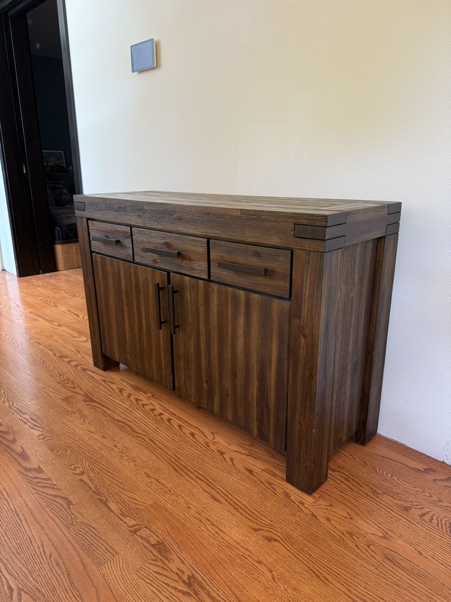 Just in time for Christmas! Here’s a beautifully designed contemporary cabinet. Quality hardwood construction with three easy-gliding drawers up top, with two spacious cabinet spaces below. Lower section is divided into two with a single mid-height and removable shelf to help organize all your things. Bought new from Macy’s in 2017 - part of their “Avondale “ contemporary collection. Dimensions: 48” W x 31” H x 16” D