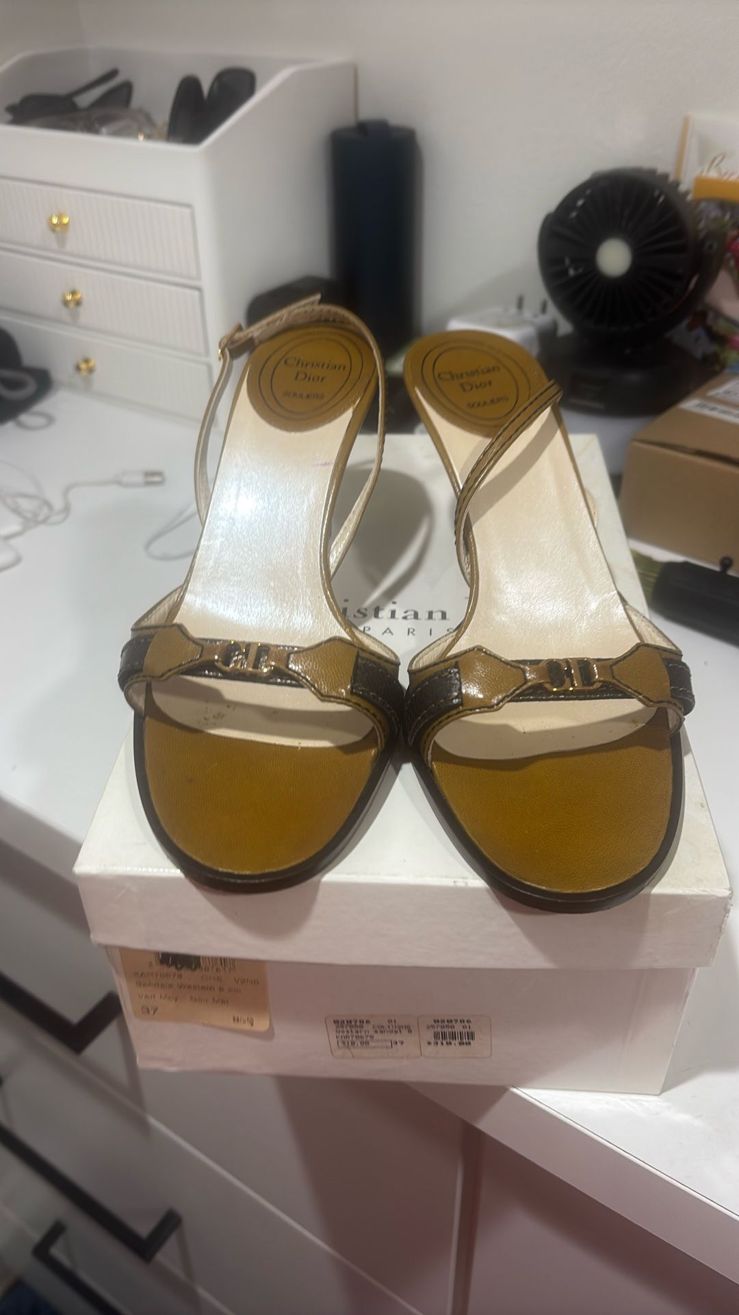 normal wear visible on the front, but still maintains its shape and shine. The gold medallions are bright and eye-catching, giving the shoes that classic Dior luxury look.
