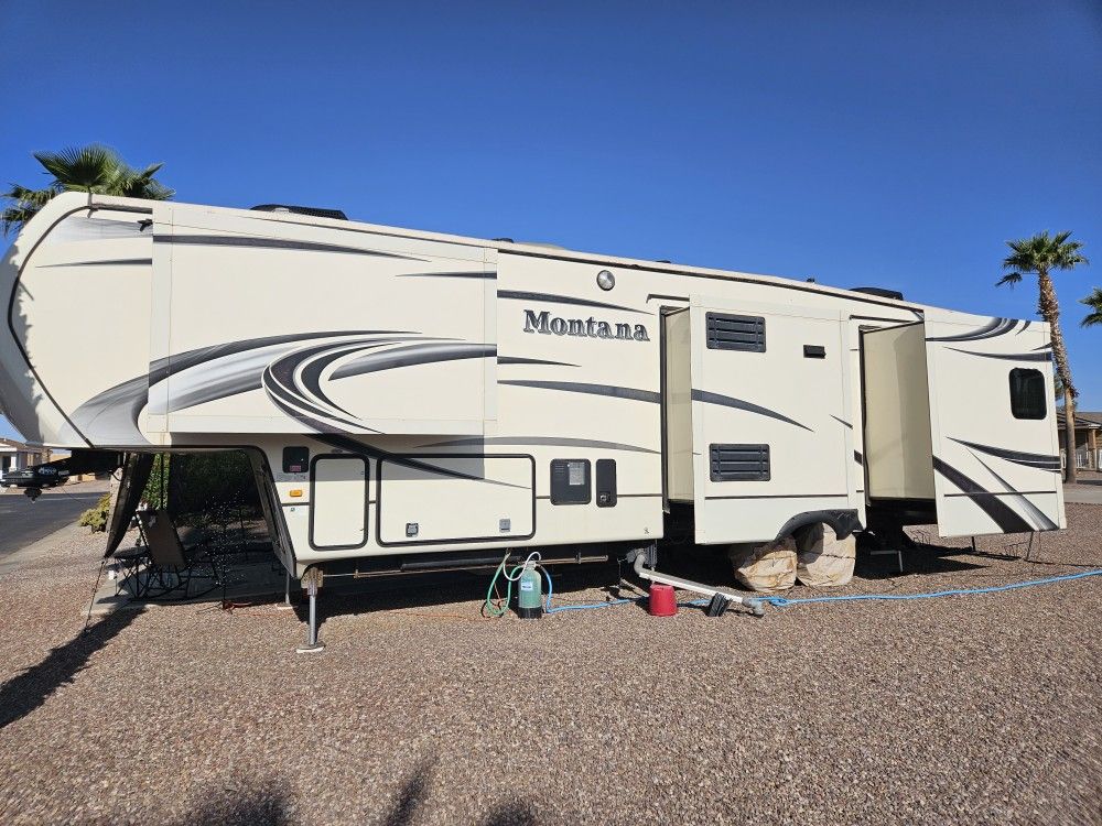 With four slides, you have large living room with t v and electric fireplace.The kitchen has a gas stove with convection oven, microwave Double door refrigerator gives plenty of food storage Bedroom has two large closets, a vanity with sink and cabinet Private bathroom with the second sink is convenient.The shower is large with a sit down seat