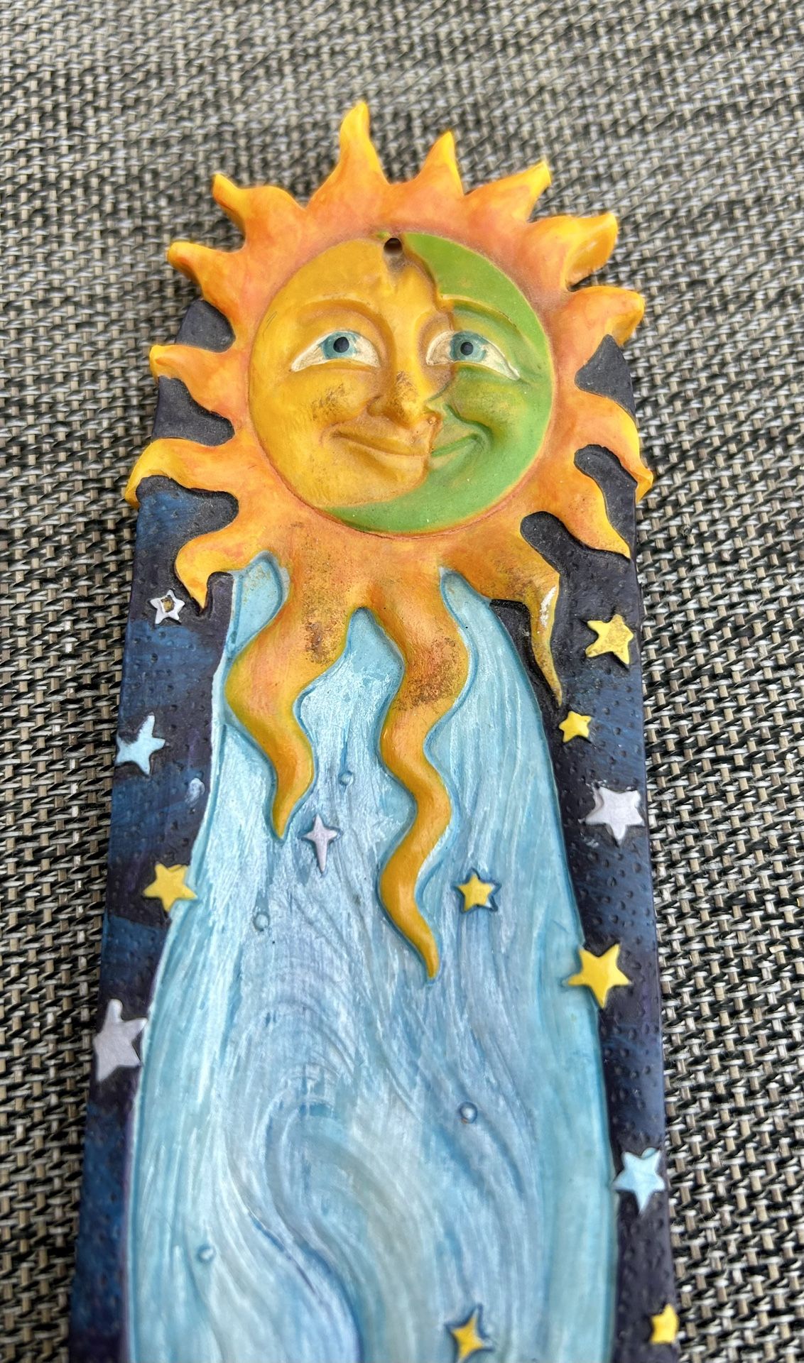 Unique incense holder with a sun and moon design, lots of little stars and a blue wavy pattern. Place for incense stick at the bottom.