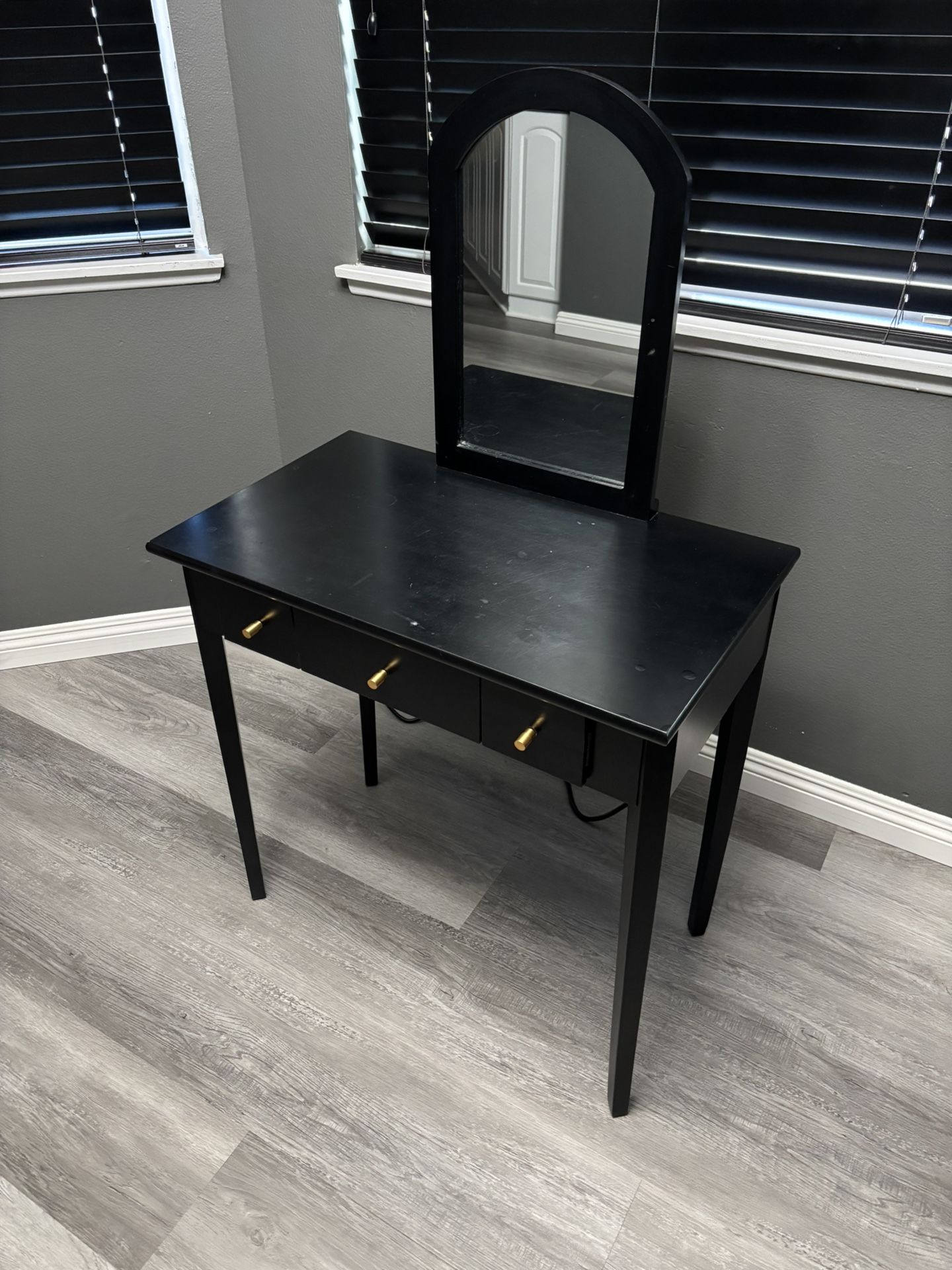 •Vanity with Mirror •Color: Black •Plug in/USB Station •Comes with an extra pair of different knobs *Gray* see last picture •Measurements: 30”L x 17.5”W x 51.5”H
