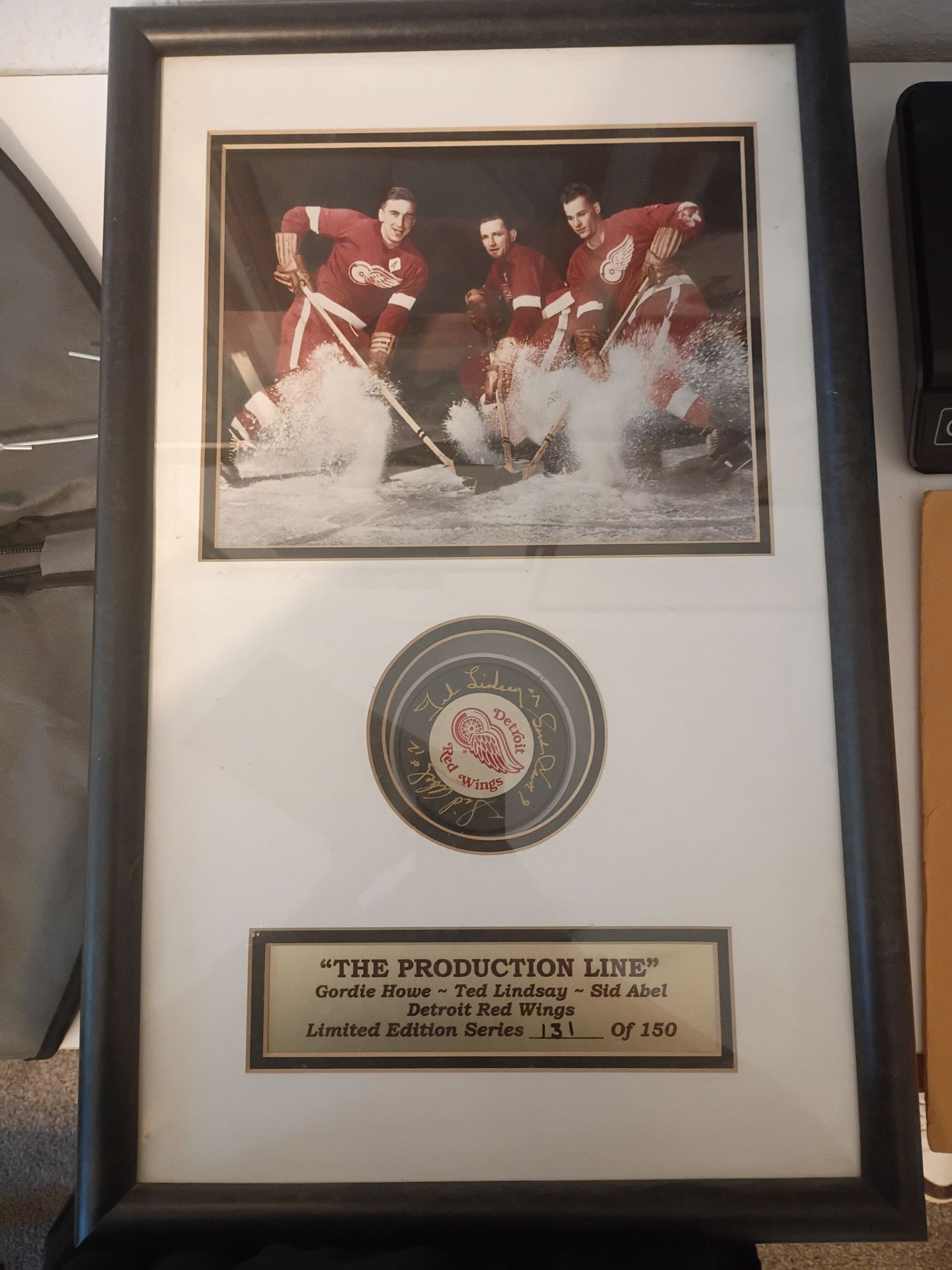 The production line gordie howe ted Lindsey sid Abel framed signed puck limited edition 131 of 150 in Reno will ship 800 obo