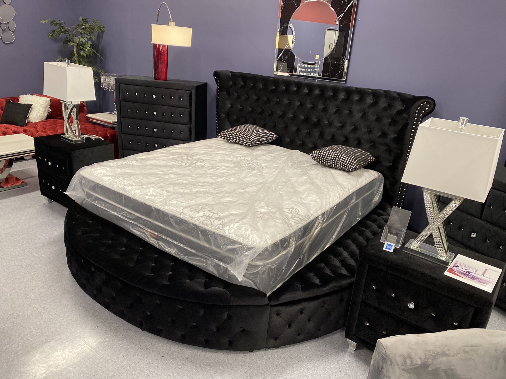 Slivano Grand Round Bed Frame 🔊Bluetooth Speakers 🔊 And USB 🔌 Charging Ports, Add +$400 For King Size Silvino Round Storage Bed Frame 🔊Bluetooth Speakers 🔊 And USB 🔌 Charging Ports *** IN STOCK NO WAITING *** Other Available Colors with 1 Week Short Wait: Ebony Black, Deep Ocean Blue, & White Grey Velvet Tufted Platform Storage Bed Frame with Nail Head Trim, Solid Hard Wood Frames.