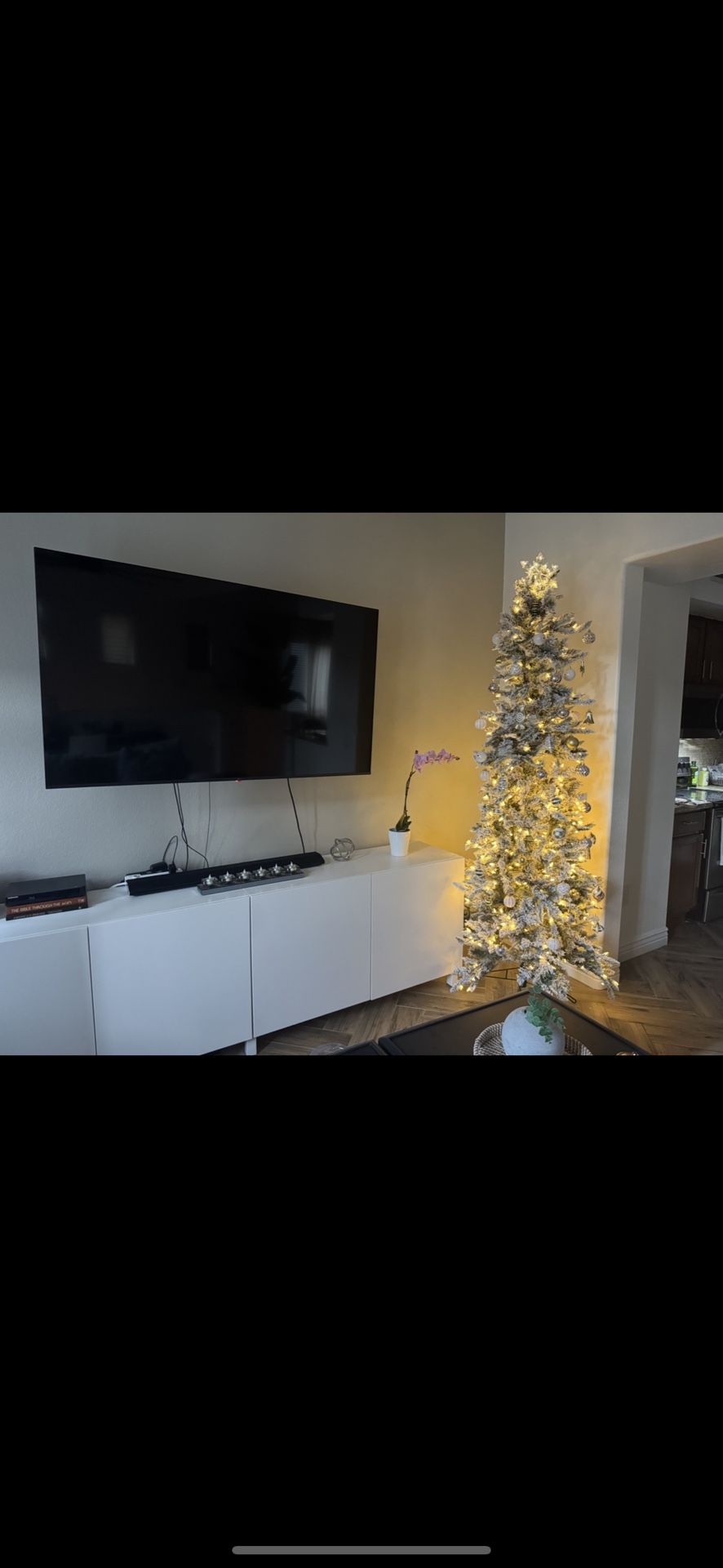 7ft pre lit flocked tree. Will include ornaments and tree topper.