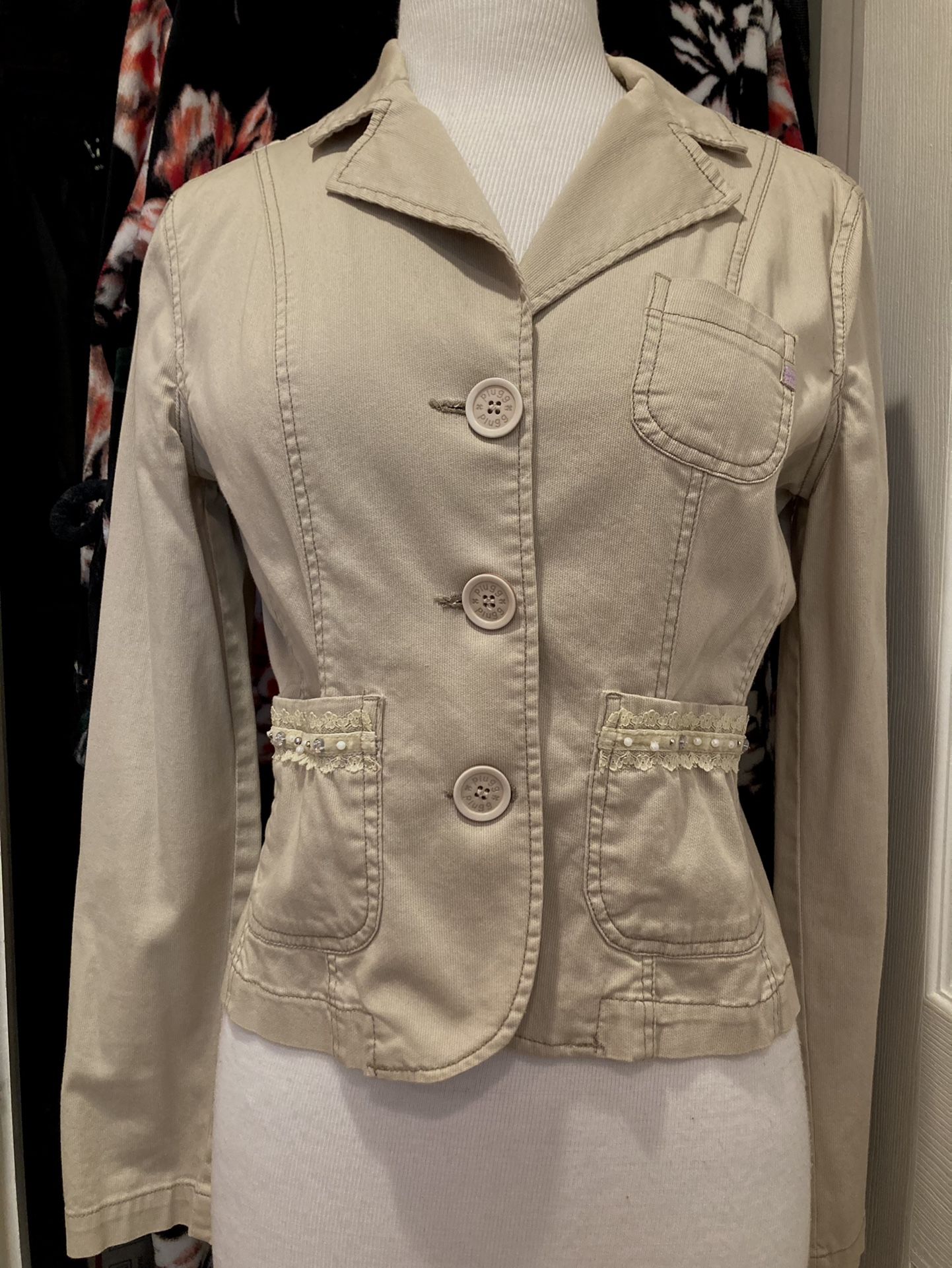 Cute casual short jacket with buttons at sleeves and 3 front pockets. Pockets have lace and bead detailing. Women’s size M, color khaki. Perfect with pants, skirts or dresses. Used but very good.