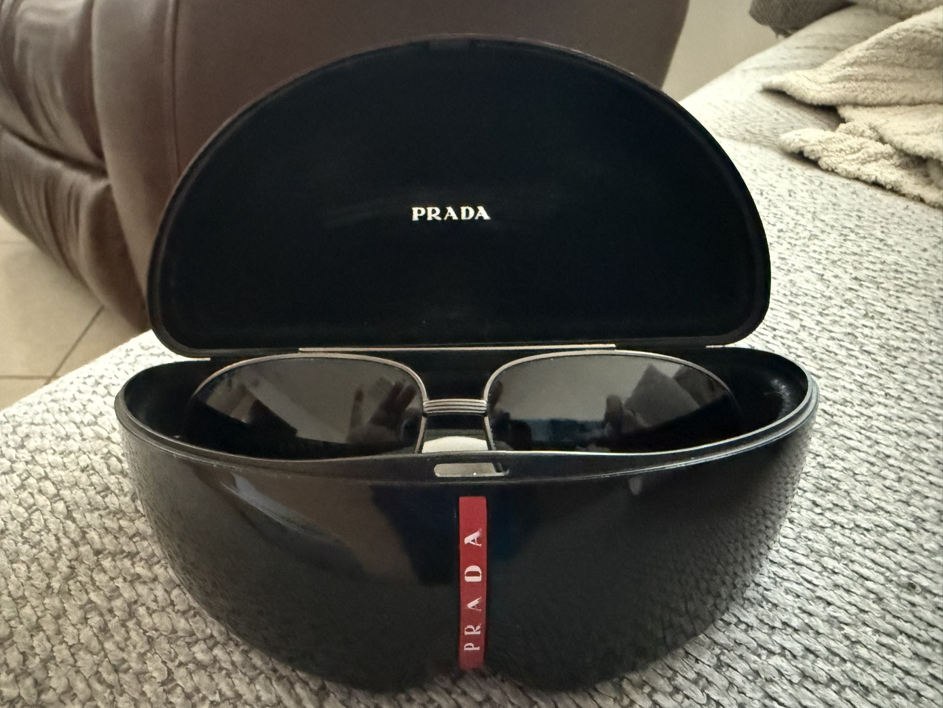 Prada SPS 58U model of sunglasses, part of the Prada Sport line. Prada sunglasses offer a blend of luxury style and UV protection. The sunglasses feature an aviator or pilot shape with a metal frame Model Name: SPS 58U / PS 58US Style: Pilot/Aviator Frame Color: Black Lens Color: Grey Measurements: Lens Width: 63 mm Bridge Width: 12 mm Temple Length: 135 mm