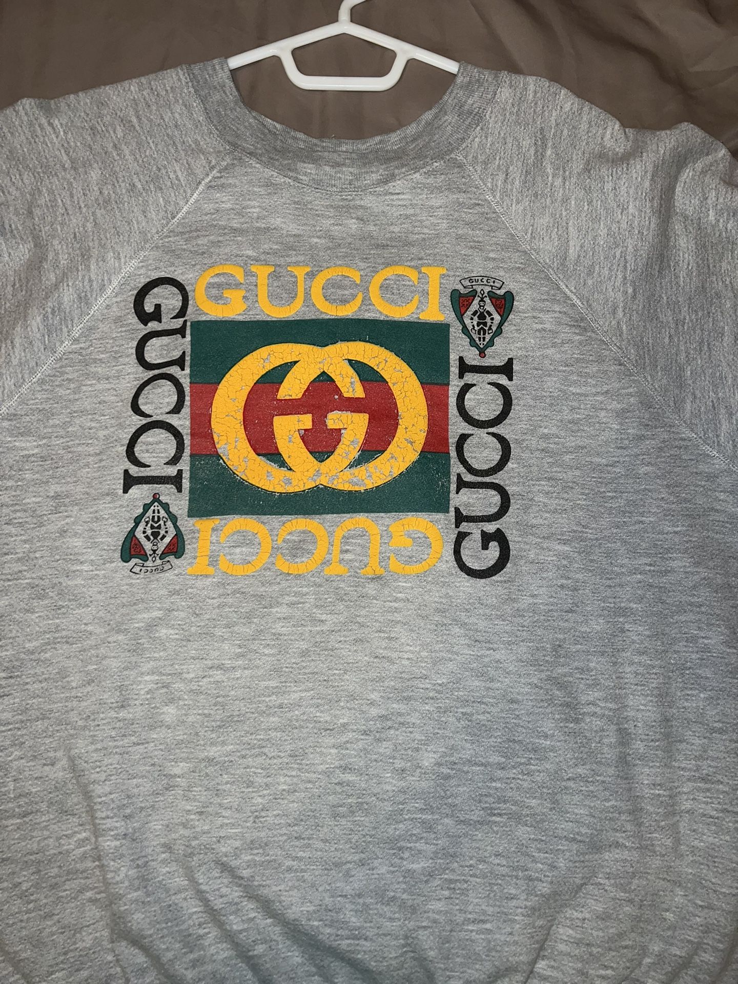 Vintage Gucci crewneck Men’s M Would fit a womens s/m perfect The big Gs in the yellow Gucci logo are starting to come off a bit, not sure if there is something out there to fix that. But it is an old sweater, don’t know the exact year but it’s definitely vintage. It does have a small hole on the bottom right of the sweater. A quick sew should fix it.