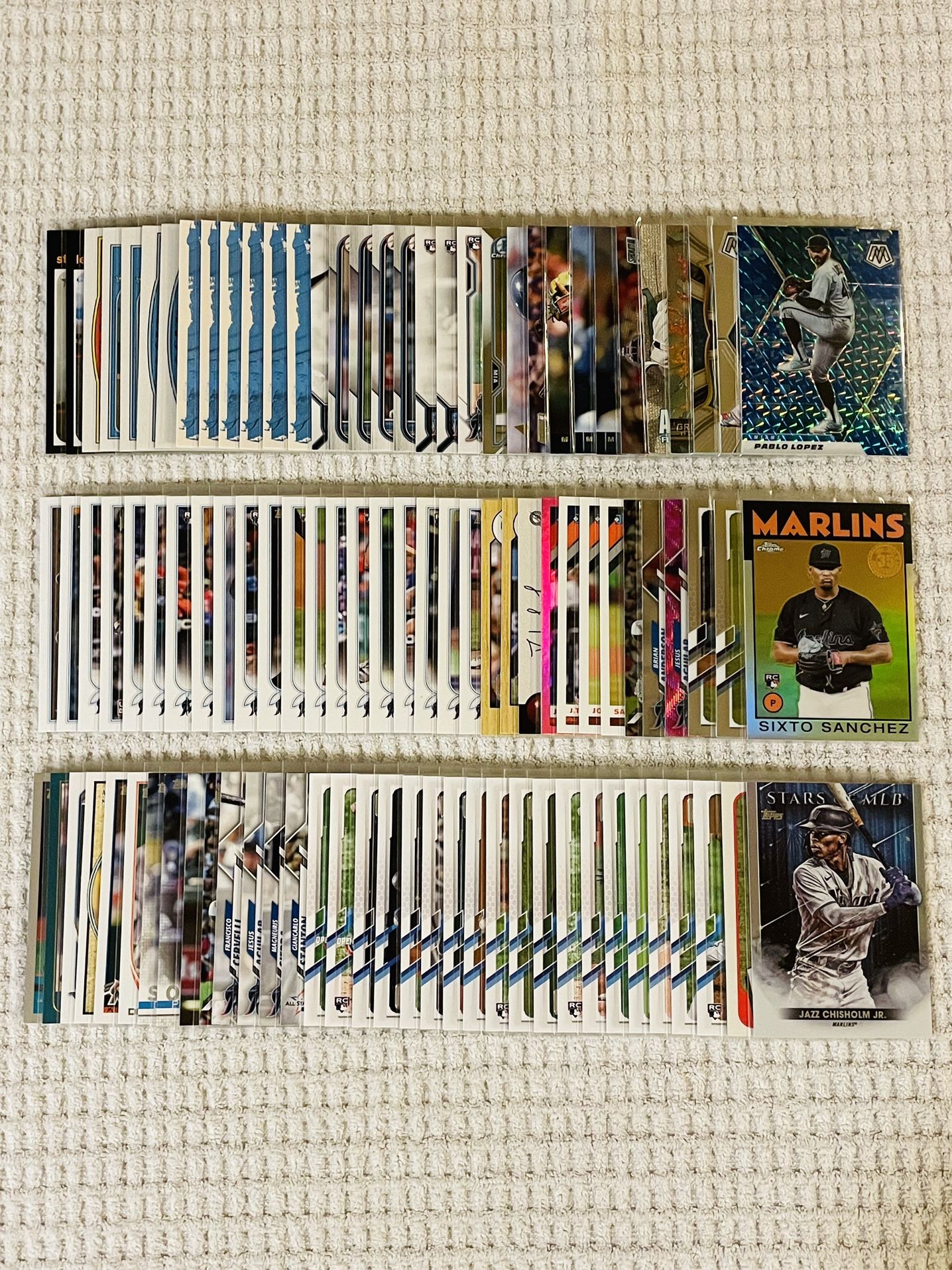 Miami Marlins 100 Card Baseball Lot! All cards in mint condition! Rookies, prospects, All-Stars, inserts, parallels, prizms, variations & more! Mix of Topps & Panini. Bowman, Mosaic, Select, Series 1, Series 2, Update Series, Opening Day, Topps Chrome, Stadium Club, Stadium Club Chrome, Donruss, Diamond Kings, Heritage & more! Jazz Chisholm, Bryan De La Cruz, Jesus Sanchez, Miguel Rojas, Garrett Cooper, Jon Berti, Pablo Lopez, Sandy Alcantara, Sixto Sanchez, Edward Cabrera, Jesus Luzardo, Trevor Rogers, Braxton Garrett, Brian Miller, Nick Fortes, Max Meyer, Jose Salas, Giancarlo Stanton, Dontrelle Willis & much more! $42 for the lot! Local pick up & shipping available. Message for details. Thank you!